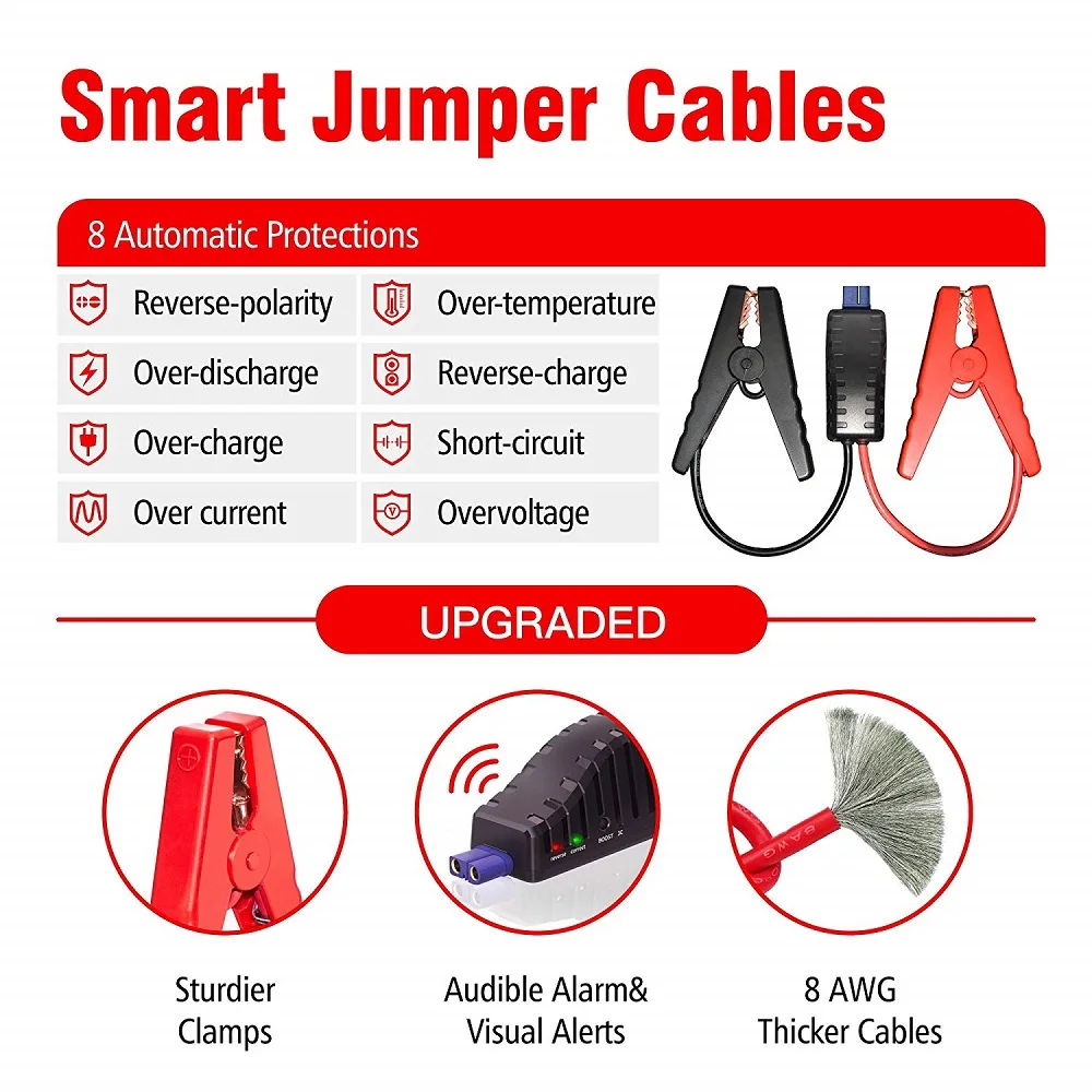 Внутренний литий-ионный стартер уже получил сертификаты RoHS, FCC и CE. Более того, этот портативный стартер использует модернизированные смарт-кабели перемычки с восемью встроенными защитой, звуковыми сигналами и визуальными оповещениями в чехол для любого неправильного подключения, перегрузки по току, короткого замыкания, перегрузки, перенапряжение, перезарядка. Все эти средства защиты эффективно защитят Вас и ваш автомобиль от опасности.