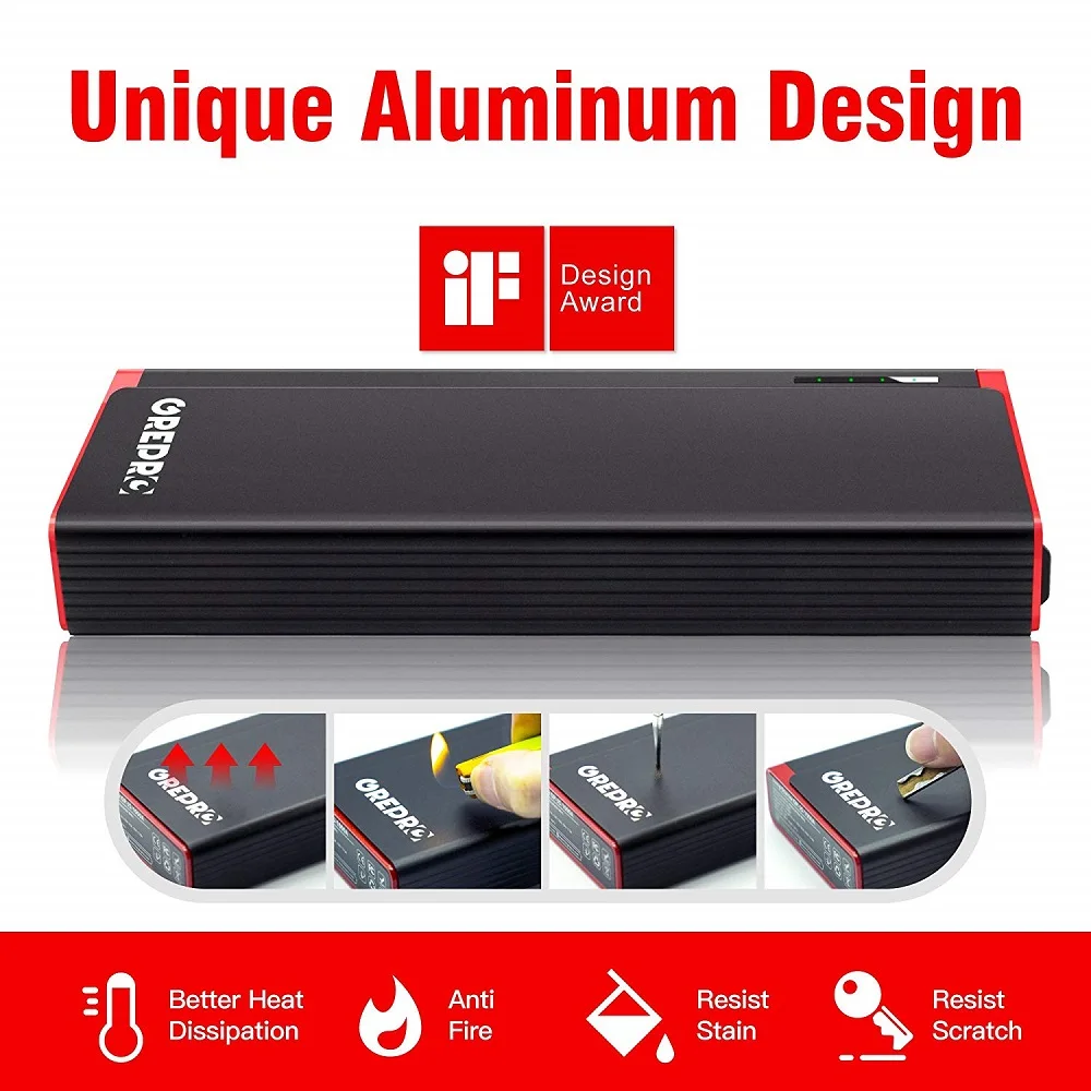 В отличие от большинства стартеров, портативная автомобильная аккумуляторная батарея Grepro использует металлический сплав премиум класса вместо пластика и резины. Металлический Чехол Лучше выдерживает столкновения, защищает от царапин и пятен, защищает от огня и рассеивает тепло. Кроме того, это победитель международной премии iF Design Award, которая известна как «Оскар» в области дизайна продукта.
