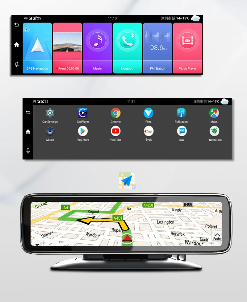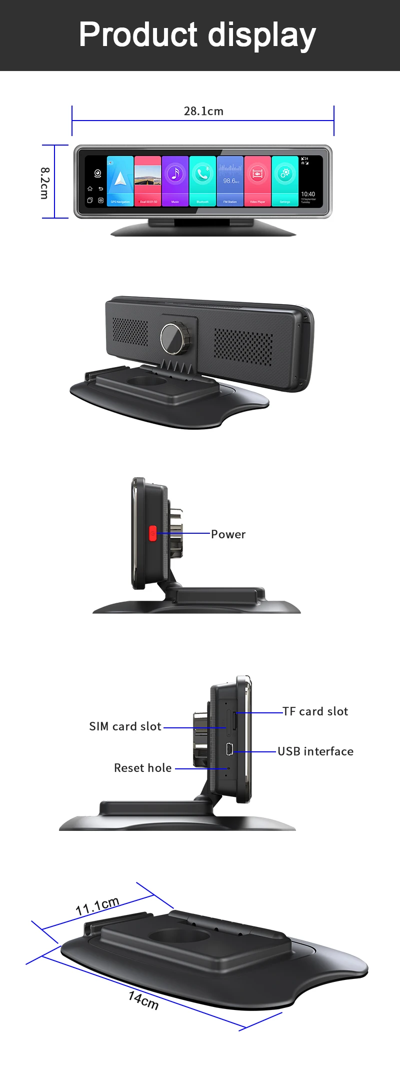 1. 12 дюймовый сенсорный экран 2. 4 камеры записи одновременно (передняя + задняя + правая + левая камера записи), ночное видение 3. Угол обзора 360 градусов 4. android 9,0 2 + 32G для хранения 5. Поддержка gps-навигации 6. Встроен в google play market 7. Поддержка функции ADAS 8. Прямой WIFI и функция BT 9. 24H монитор парковки 10. Поддержка Интернет-диапазонов 4G, как показано ниже: 2G GSM B5/B3/B8; 3G WCDMA B1/B5/B8; 4G TDD-LTE B38/B39/B40/B41; 4G FDD-LTE B1/B3/B5/B8 11. Функция мобильного удаленного монитора 12. Поддержка внутренней связи 13. Поддержка потокового видео в режиме реального времени на телефоне 14. Поддержка воспроизведения истории отслеживания GPS 15. Платформа для отслеживания cmsv6 16. Запись видео и изображений через приложение 17. Название приложения: автопомощь 18. Основание центральной консоли
