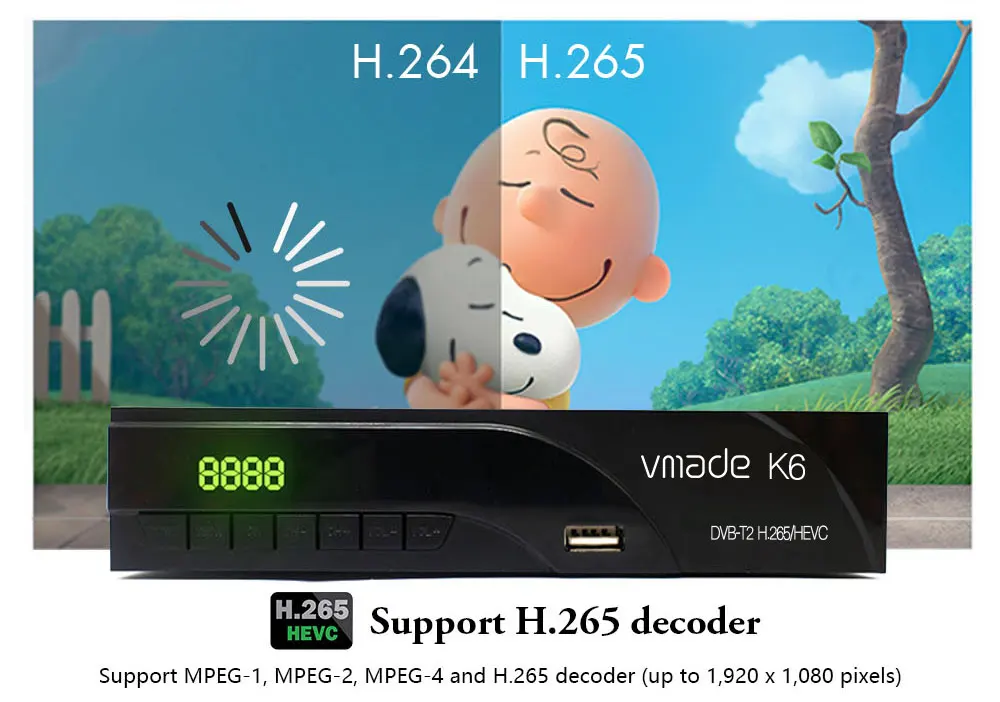 -Полностью соответствует стандарту DVB-T/T2 и совместим с кодеком H.264 (MPEG-2/4) и H.265/HEVC.