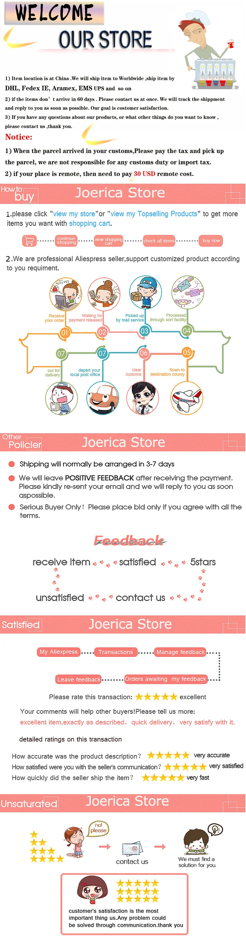1. Если вы выбираете «способ доставки продавца», пожалуйста, обратите внимание, что эта стоимость доставки применима только в некоторых странах/регионах, поэтому после оплаты, пожалуйста, свяжитесь с нами, и мы подтвердим с вами.