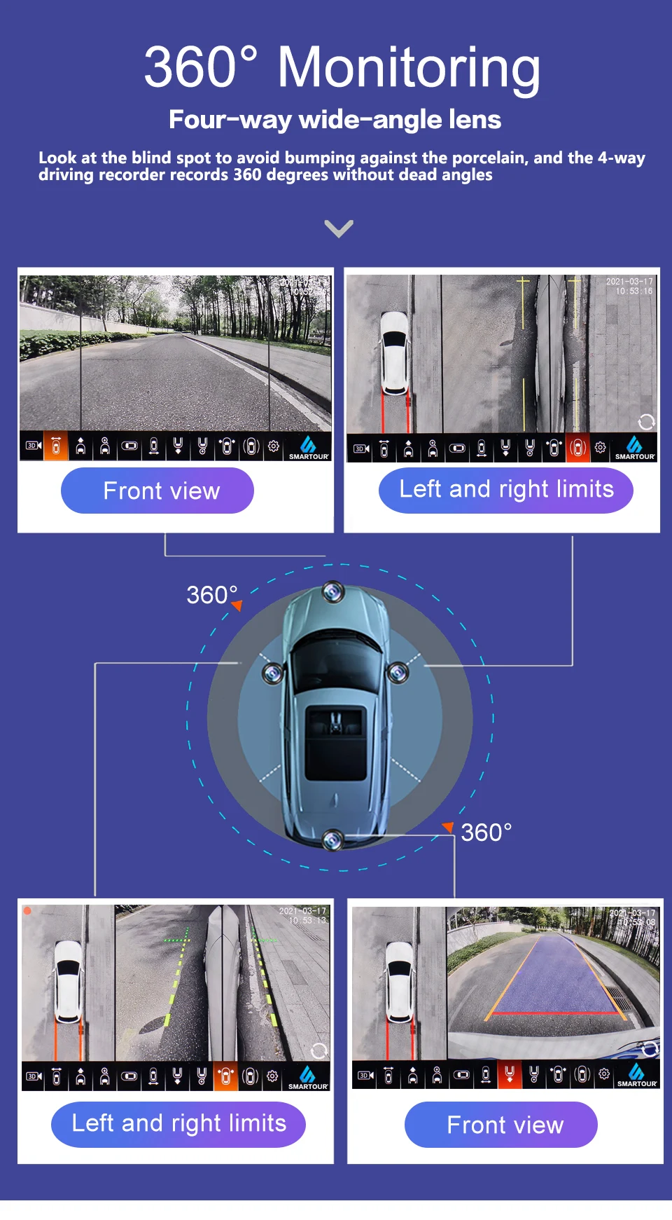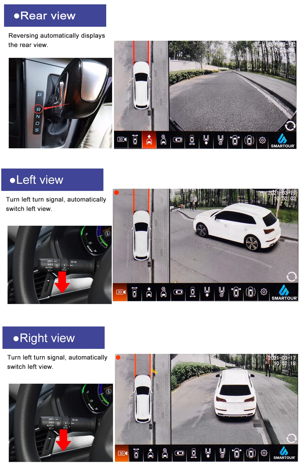 Особенности: Av-выход разрешение 1920x1080. Язык меню: английский Функция: 1. Все виды режима просмотра 2. Поворотный пульт дистанционного управления. 3. После запуска автомобиля, автоматически круговой дисплей (можно отключить его), также можно регулировать угол с помощью пульта дистанционного управления 4. Поддержка нескольких моделей 2D, 3D 5. Поддержка AV (CVBS), VGA, AHD, видео формат, легко изменить в меню 6. Высокое разрешение: 1920x1080P 7. Поддержка полной автоматической калибровки, бесшовная калибровка, отсутствие слепых пятен 8. 4 способа записи и воспроизведения видео, MP4 видео файл. 9. Мониторинг парковки 10. Круговая запись, новый файл автоматически закрывает старый файл. 11. Можно сохранить важное видео, избежать потери 12. Поддержка U disk storage video Основная функция: Когда автомобиль задним ходом, поверните влево или вправо, 360 система триггера сигналом лампы, автомобильный экран автоматически переключается на задний, левый, правый вид, затем показывает передний обзор после запуска. Как открыть 360 вид птицы: 1. При запуске автомобиля 2. Нажмите пульт дистанционного управления 3. Двойной пресс для автомобиля "аварийный предупреждающий светильник" 4. Триггер сигналом лампы