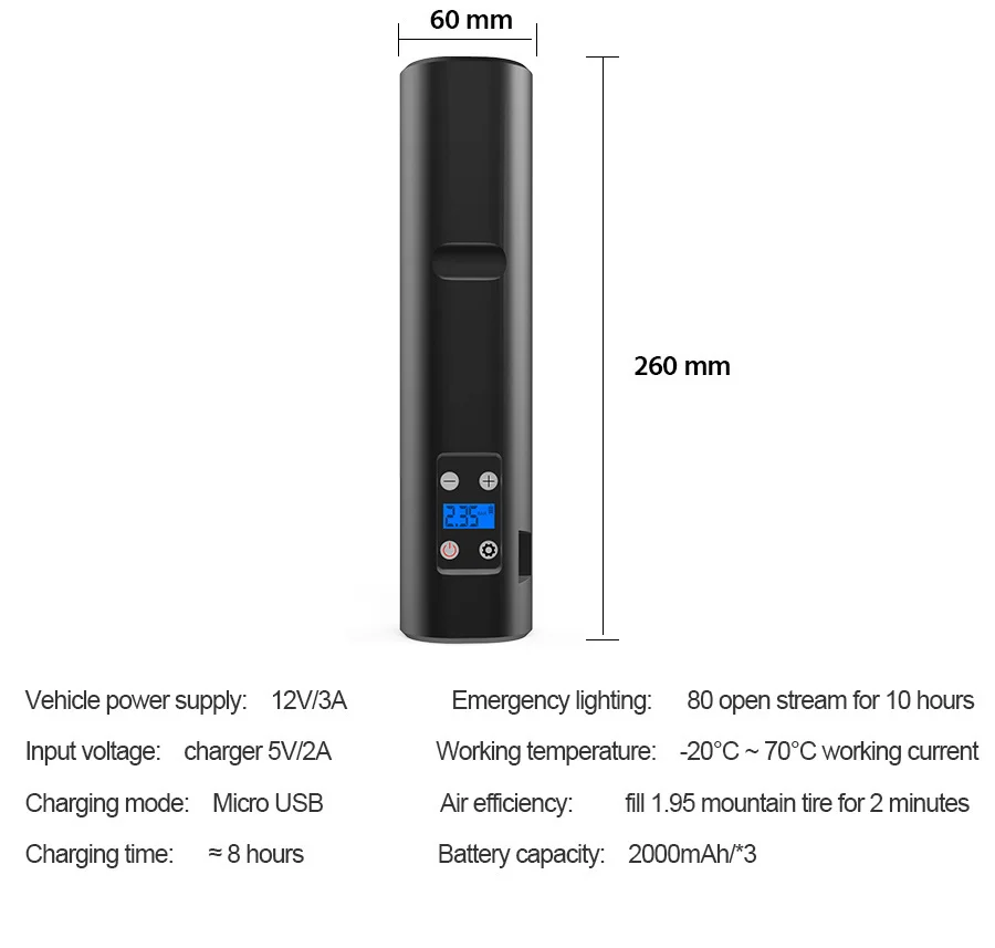 1. Этот воздушный компрессор позволяет надувать Стандартные шины среднего размера от 0 ~ 36PSI (0-248KPA) всего за 4-6 минут.