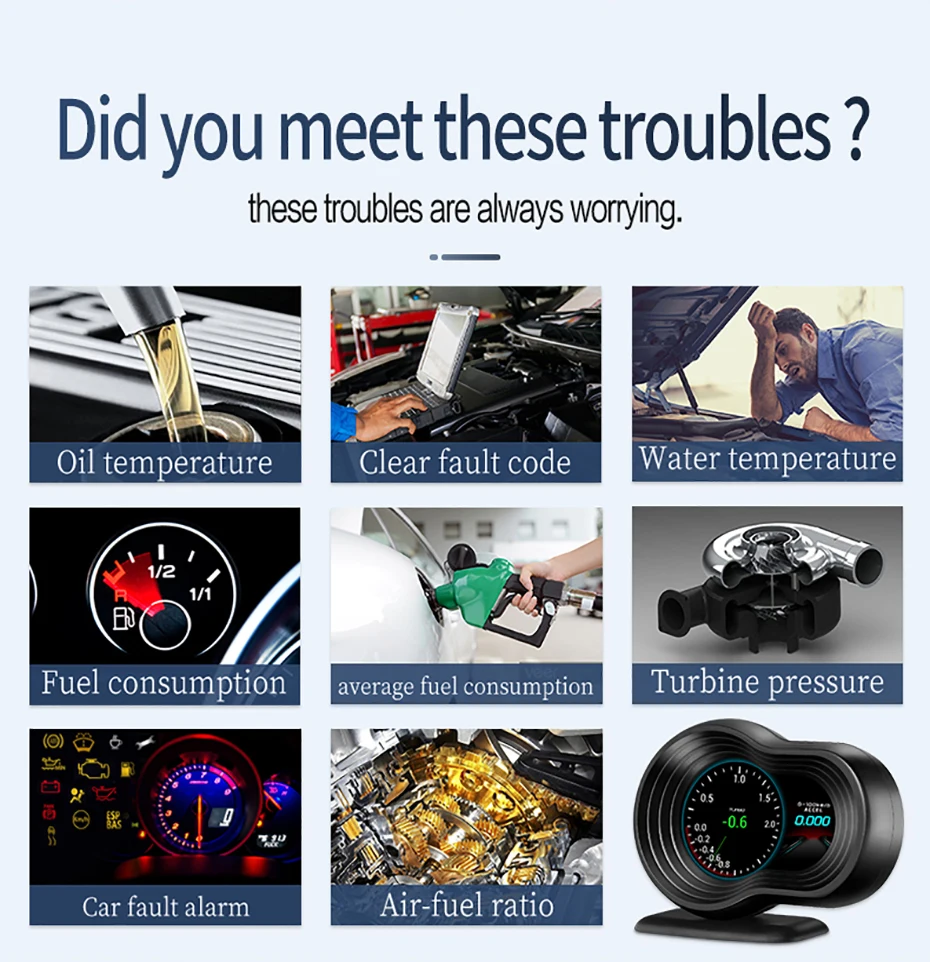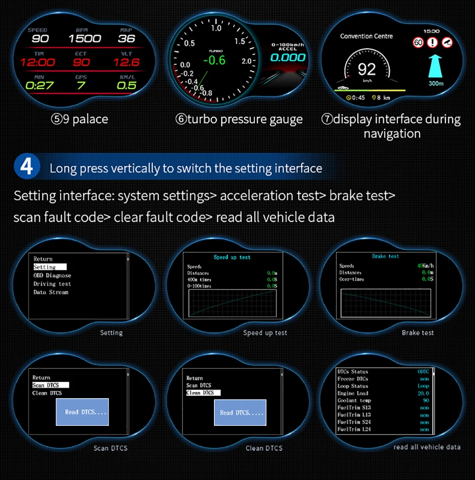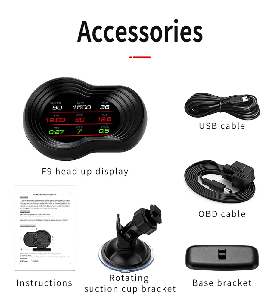 Название продукта: F9 Автомобильный дисплей Размер дисплея: 122 мм * 91 мм * 66 мм Система: OBD2 + GPS навигация Экран: ЖК-экран HD Режим OBD: 1. Параметры: скорость, температура воды, напряжение, расход топлива, скорость вращения, расстояние, время вождения, время, температура моторного масла, Километры на литр, соотношение воздушного топлива, турбо давление, давление на входе, количество сателлитов, направление движения, испытание тормозов, считывание потока данных 2. Сигнализация: сигнализация с превышением скорости, сигнализация скорости, сигнализация с высокой температурой воды, сигнализация с низким напряжением, сигнализация с отказом двигателя, четкий код неисправности Режим GPS: 1. Параметры: скорость, время вождения, высота, количество сателлитов, направление движения, один пробег, напряжение, испытание на ускорение, испытание тормозов 2. Сигнализация: сигнализация с превышением скорости, сигнализация с низким напряжением Особенности: 1. Двойная система OBD + GPS, применима ко всем моделям. 2. Различный интерфейс дисплея, настройка различной информации приборной панели. 3. Установите страницу опции функции, легко понять. 4. Настраиваемая версия Google, поддерживает несколько языков по всему миру. 5. Это HUD с навигационной функцией, экономичным и практичным. 6. Подключение к мобильному устройству, легко настроить. 7. Дисплей высокой четкости, четко показывает реальные цвета. 8. Высокопроизводительные чипы обработки, мощная производительность и совместимость, две системы, двойная память и двухъядерные процессоры обеспечивают плавную высокоскоростную работу.