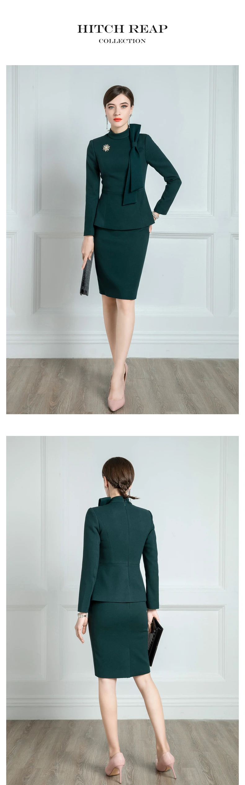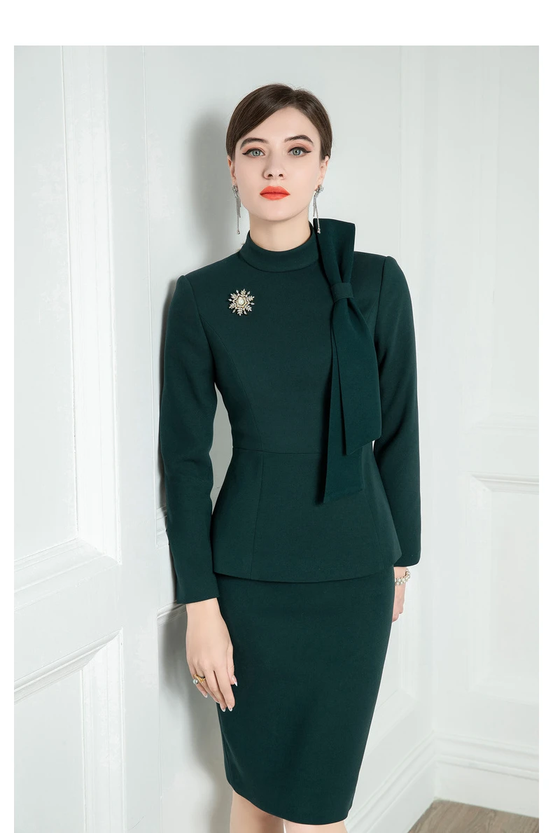 Женский элегантный костюм в темно-зеленом цвете, способный выглядеть как нежно, так и интеллектуально, выглядит элегантно. Ищем вариации в неизменных законах и начиная с уверенности в современном ретро-стиле. Стандартный воротник подчеркивает скромность и интровертный стиль, и врывается в новую волну ретро. Бант на груди кажется простым, но на самом деле он содержит загадку. Плавные и атмосферные линии имеют естественную форму, как ремесло, что нарушает неизменный закон, а затем приходит огласка личности и свободной и легкой. Талия намеренно увеличивает объем включительно, будь то стройная леди или женщина, страдающая животом, может попробовать легко носить ощущение стройной талии. Версия для самосовершенствования как всегда наследует элегантный и достойный стиль юбки на бедрах, а длина Юбки До Колена позволяет вам ходить с легкостью.