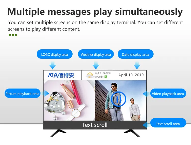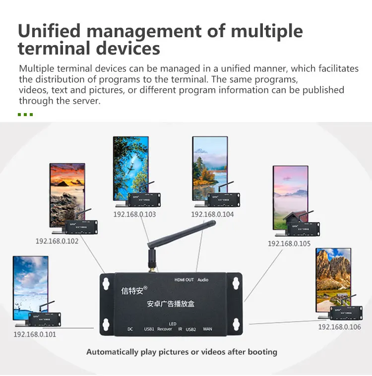 3) дисплей терминала: дисплей терминала в основном включает контроллеры, передатчики и различные Дисплейные устройства. Он принимает и выполняет мультимедийную информацию и элементы управления, контролируемые центром. Он автоматически транслируется в соответствии с расписанием через программное обеспечение терминала. Терминальный дисплей может создавать унифицированную информационную платформу на основе различных устройств отображения, таких как ЭЛТ-дисплеи, жидкокристаллические дисплеи, плазменные экраны, проекторы, сенсорные машины и все-в-одном.