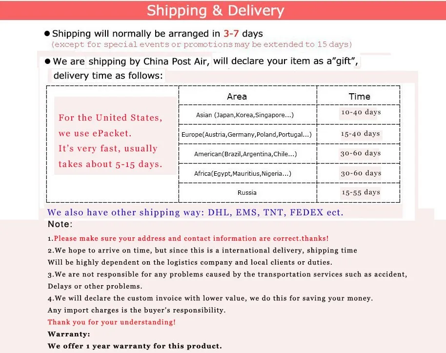 We are not responsiblefor problems caused by shipping company, as well as import charges.FeedbackYour positive feedback is our best encouragement and power. Hope to receive your 5 star feedback if you are satisfied about our item.