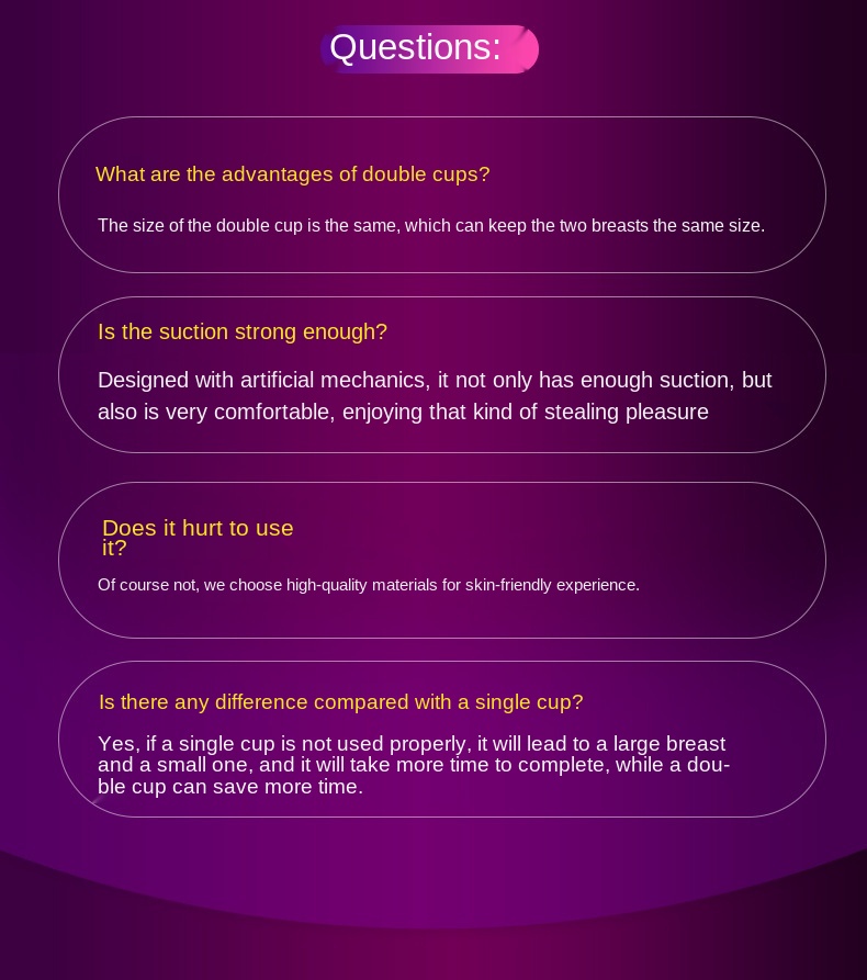 Двойная чашка имеет изобилие инструмента вакуумным давлением, имитирующим человеческий биологический ритм отрицательного давления адсорбции на теле, в то же время автоматическое всасывание может сделать грудь иметь ритм каскадного типа аэробных упражнений, inspire и гипофиз, эстроген, гормон роста и секреция гормонов, Быстро увеличивают объем груди и укрепляют здоровые мышцы грудной клетки, усиливают связку грудной клетки. Кинетическая энергия может способствовать циркуляции крови в груди для увеличения блеска, тем самым делая грудь твердой и полной. Сильный и пружинный.
