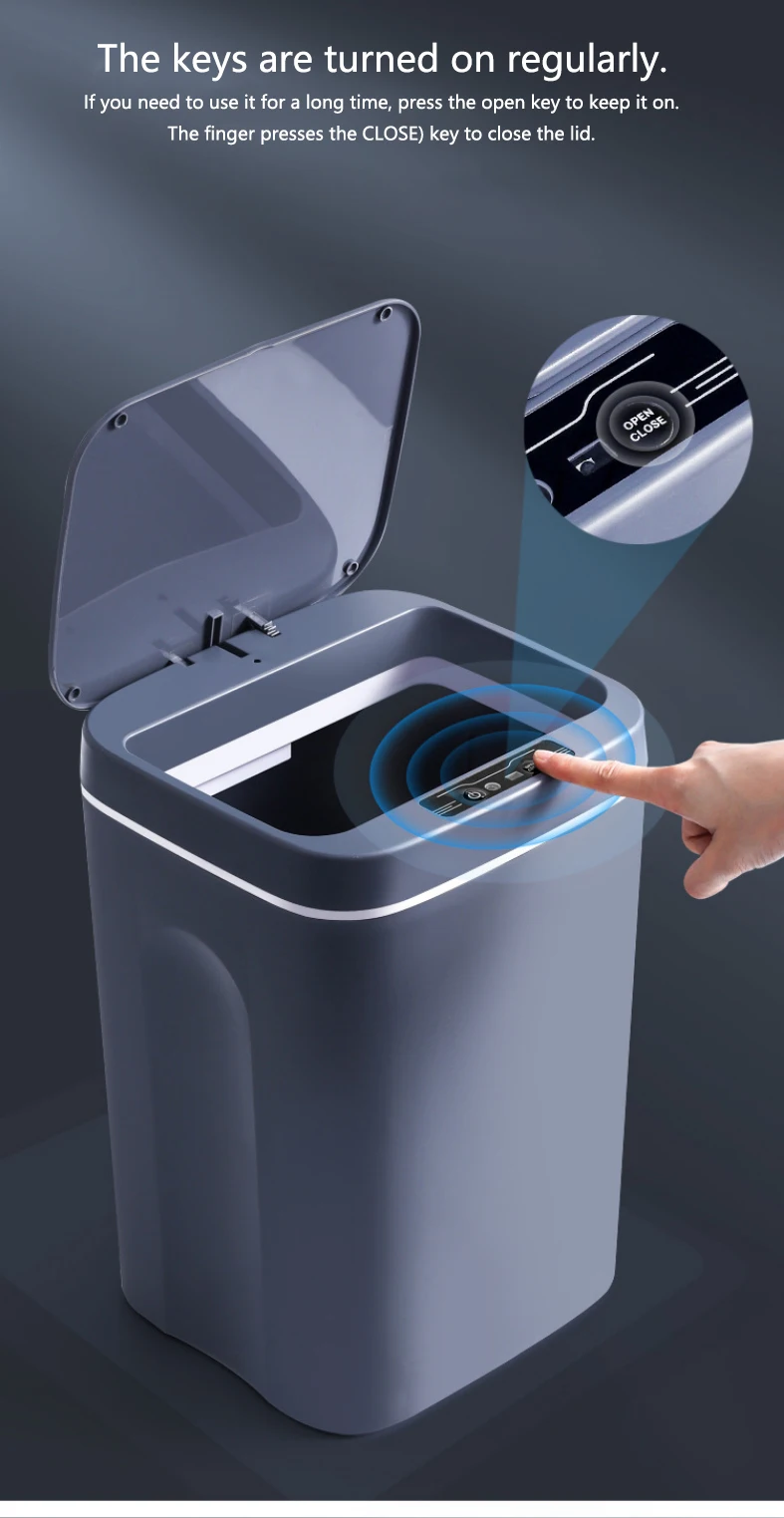 Смарт-панель Три режима, легко работать, как ногами, так и чувствительностью Водонепроницаемое резиновое кольцо Встроенное водонепроницаемое кольцо позволяет удобно надевать мешок для мусора и предотвращает утечку воды от повреждения электронного чипа Длительный срок службы батареи и низкое энергопотребление Умный чип Многофункциональная технология Asana Усовершенствованная версия большого смарт-чипа, более чувствительное восприятие, более стабильная производительность, низкое энергопотребление, сильное анти-помехи и бесшумный Откройте с волной 0,3 s Быстрый ответ без ожидания Интеллектуальное закрытие, оно автоматически закроется после выхода из зоны зондирования в течение 7 секунд, проектное расстояние срабатывания составляет 30 см Прочный. От бесщеточного двигателя Высокоскоростной стабильный Внутренний сердечник и бесшумный Шестеренчатый вал делают процесс переворачивания гладким и не застревает. Соответствующая система динамического баланса уменьшает повреждения и дольше. Вал зубчатой передачи использует высококачественную смазку, а басовая работа более Тихая.