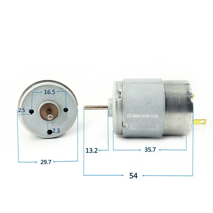 Модель:RS-385PV-2270Характеристики двигателя: 29,7*35,7 ммПолная длина двигателя: 54 ммВыходной вал: 2,3 ммДлина выходного вала: 13,2 ммВес: 81,4 г