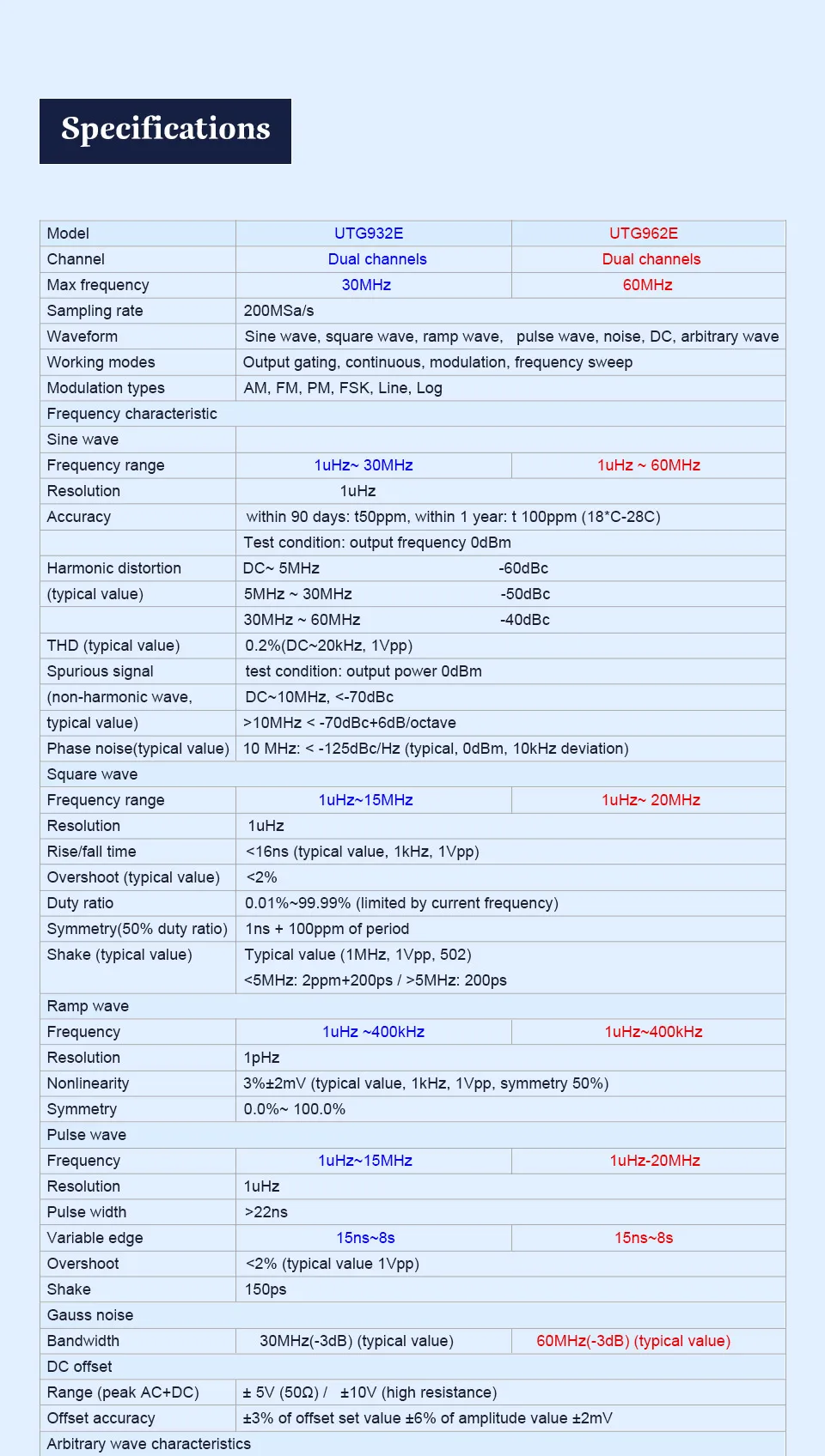 ● Выходной сигнал: синус, квадрат, пульс, пандус, шум, постоянный ток, произвольный● Диапазон выходной частоты: 1μHz-30MHz/60MHz● Высокой точности, широкополосный доступ 6 бит счетчик частоты, диапазон: 100 МГц ~ 100 МГц● Два эквивалентных канала производительности● 4,3 дюймов TFT ЖК-дисплейМодели и сравнениеТехнические характеристики