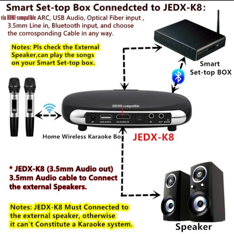 Когда смарт-телевизор подключен к K8, используйте HDMI-совместимую дугу, USB аудио, оптоволоконную линию ввода в bluetooth вход, и выберите Разъемный кабель любым способом,