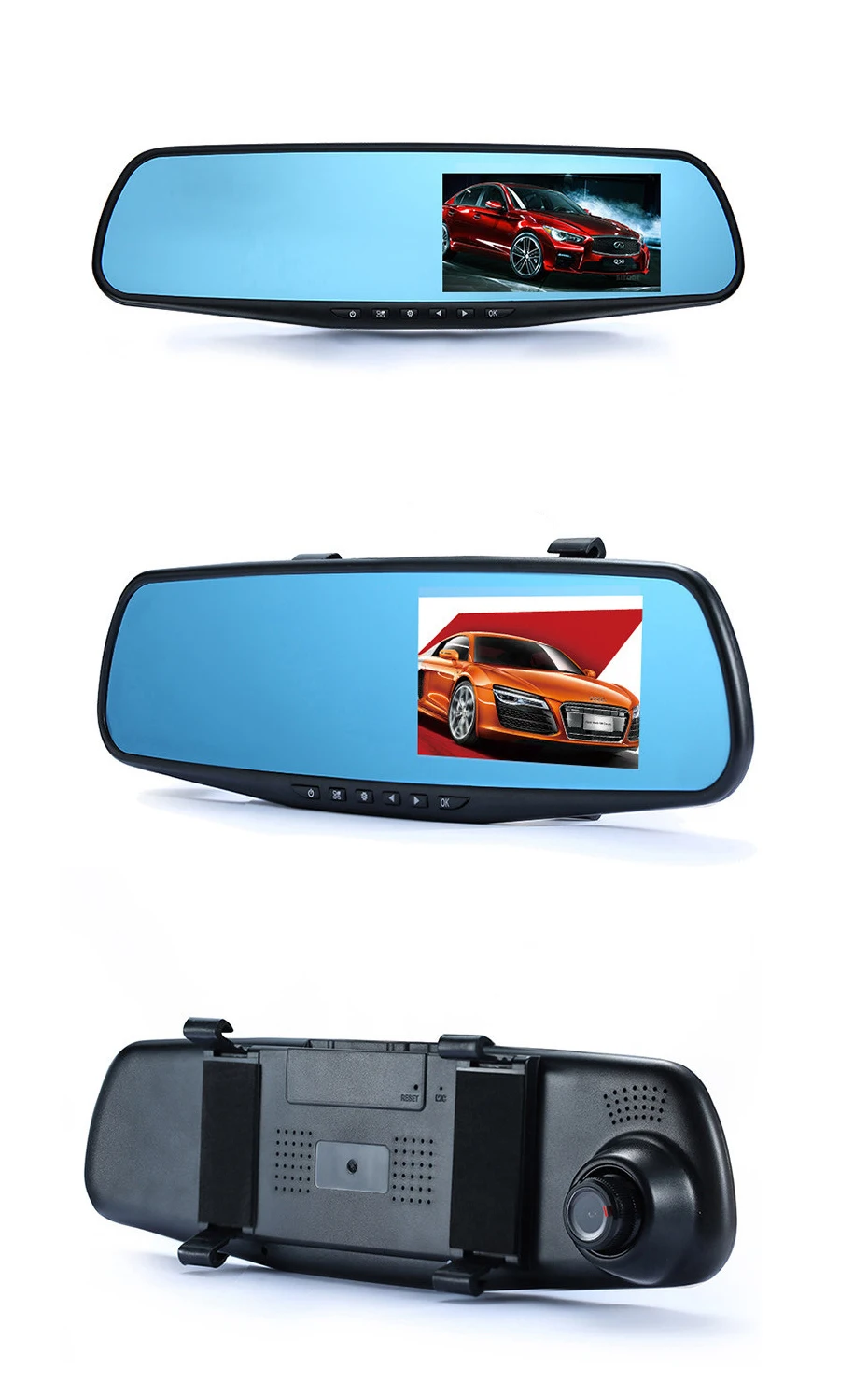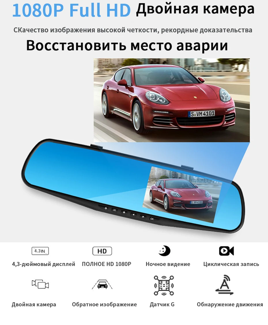 Тип проекта: зеркало заднего вида Автомобильный видеорегистратор Формат видео: AVI Язык OSD: английский, русский, корейский, испанский, японский, французский, немецкий, итальянский, португальский Дисплей Размер: 4,3 "ЖК-дисплей экран Специальная функция: циклическая запись, цифровой зум, двойная камера, g-сенсор, светодиодный дисплей, микрофон, обнаружение движения, ночное видение, отображение времени и даты Кадров в секунду: 30 Камера: 140 градусов + сверхширокоугольный объектив высокого разрешения Обнаружение движения: Поддержка Синхронизация времени: Поддержка Фото Формат: JPEG Разрешение видео: передний FHD1080P 1920*1080, задний 640*480P Карта памяти: TF (максимум 32 ГБ) Микрофон: Поддержка Встроенный стерео: Поддержка Мониторинг парковки: поддержка (большинство покупателей будут покупать парковочные линии вместе) Частота тока: 50 Гц/60 Гц
