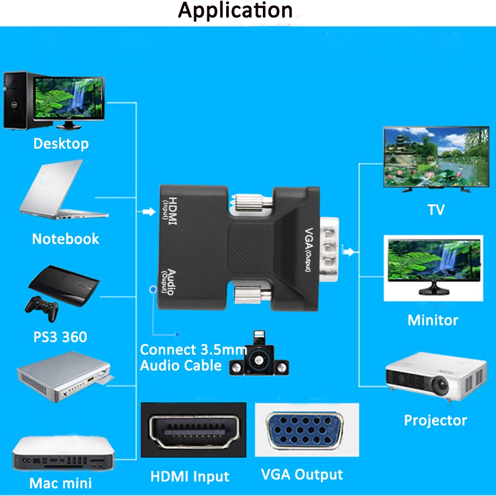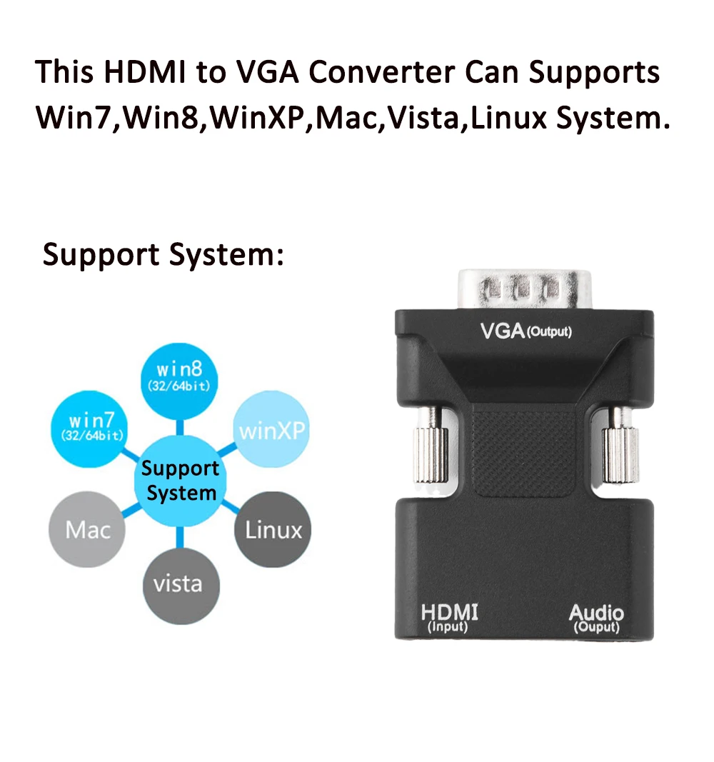 1. Этот новый HDMI-совместимый с VGA адаптер может подключить HDMI-совместимый Женский адаптер к ноутбуку настольного ПК HDMI-совместимый разъем, затем подключите штекер адаптера к кабелю VGA дисплея. Он преобразует цифровые сигналы, совместимые с HDMI, в аналоговые сигналы VGA и поддерживает разрешение full-size HD при 720p или 1080p.