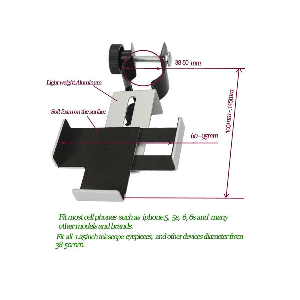 *This Item Can Connect Cellphone to Scope Telescope Binoculars Monocular Spotting Scopes *Both Astronomical Telescope and Microscope Can Use,Capturing Nice pictures and Video So Easy *Adjustable Range:Fit For Most Cell Phone Which Width Within 60 to 95mm *longitudinal Length:0 to 63mm;Transverse Length:60 to 95mm *360 Degree Rotating Phone Holder,Provide The Maximum Adjustable Range *Durable Metal Materials,Versatile and Sturdy For Long Term Use *Cellphone Clamp With Rubber Lined Don't Worry About Your Phone Scratched or Damaged *Color:Black and Silver
