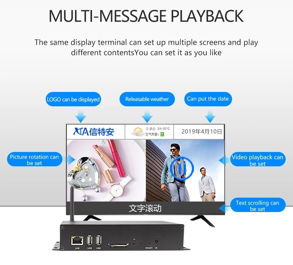 13) терминал поддерживает многомашинную синхронизацию. Благодаря простой работе, то есть в одном сегменте сети, несколько рекламных машин могут автоматически синхронизировать ту же программу. Через настройки программного обеспечения нет необходимости увеличивать затраты на оборудование.