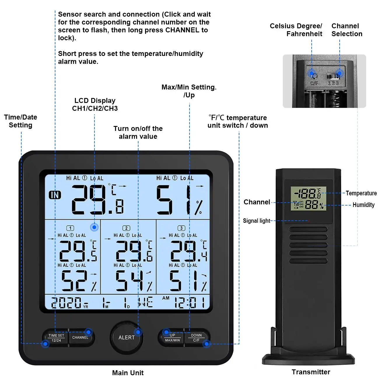 🍁Отображает внутреннюю и наружную влажность, температуру, тренд и запись максимальной и минимальной влажности/температуры 🍁Диапазон температур в помещении: 32 °F -- 122 °F(0 °C -- 50 °C); Наружный Температурный диапазон:-58 °F -- 158 °F (-50 °C -- 70 °C) 🍁Разрешение температуры: 0,1 °C/°F 🍁Диапазон влажности: 20%-99%; Разрешение влажности: 1% 🍁Единица измерения температуры: °C/°F выбирается (по умолчанию-°C) 🍁Беспроводной диапазон: открытое расстояние: около 100 м/328,1 фута Эффективное расстояние: прибл. 30 м/98,4 фута 🍁Беспроводная Частота: 433 МГц 🍁Источник питания: Погодная станция основного блока: 3x1,5 AAAbattery (не прилагаются) Беспроводной передатчик: 2x1,5 V элемент питания AAА (в комплект не входит) 🍁Размер продукта: Основная машина: 124x125x24 мм Передатчик: 104x35x17 мм