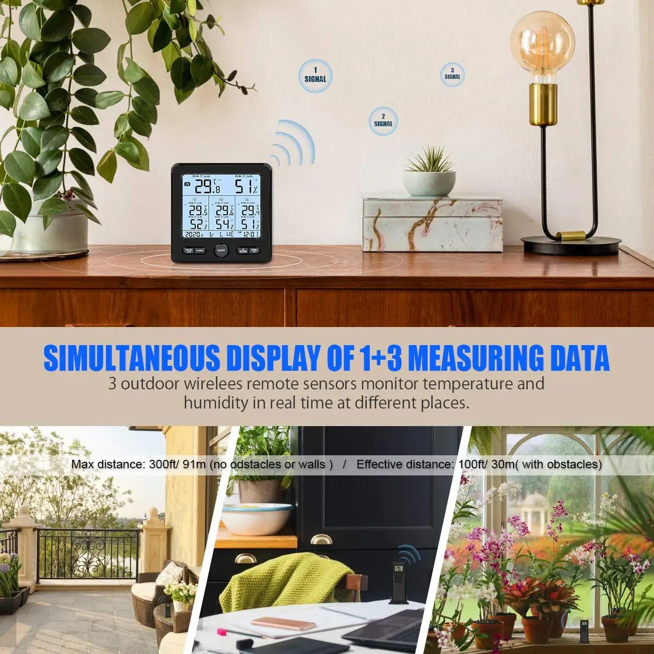 🍁【 3 беспроводной пульт дистанционного управления, включая 1 встроенную температурную консоль и 3 беспроводных дистанционных датчика, обеспечивают точные показания влажности в помещении и на улице и температуры, вы можете контролировать внешние условия, когда вы находитесь в доме. 🍁【Точные данные 】 беспроводная погодная станция обеспечивает точные показания влажности и температуры как внутри, так и снаружи. Удаленный датчик может быть быстро подключен. Сигналы сильные и стабильные. В соответствии с трендами данных о температурах на дисплее есть два трендовых значка стрелок для динамического прогноза. 🍁【Применимо для нескольких сцен 】 самое широкое расстояние установки 328ft/100m между основным блоком и датчиком на открытом воздухе, для гостиной, теплицы, кухни, внутреннего сада, теплицы, гитарной комнаты, детской комнаты, офис и подвал, убедитесь в том, что изменяются температуры, которые хороши для кожи, продуктов питания, растений, аллергенов и других проблем. 🍁【Multifunction】когда температура и влажность превышают установленные верхние и нижние пределы, приемник отправит соответствующий цвет тревоги. Один ключ для изменения «C» или «F», значок комфорта, календарная неделя, отображение времени, макс./мин, функция памяти, большой ЖК-дисплей, Делает его простым в эксплуатации и чистым в темноте. 🍁【Portable】 настенный термометр оснащен столешницей, также может быть установлен на стену. Он идеально подходит для ежедневной метеостанции, позволяя вам следить за окружающей средой из любого места.