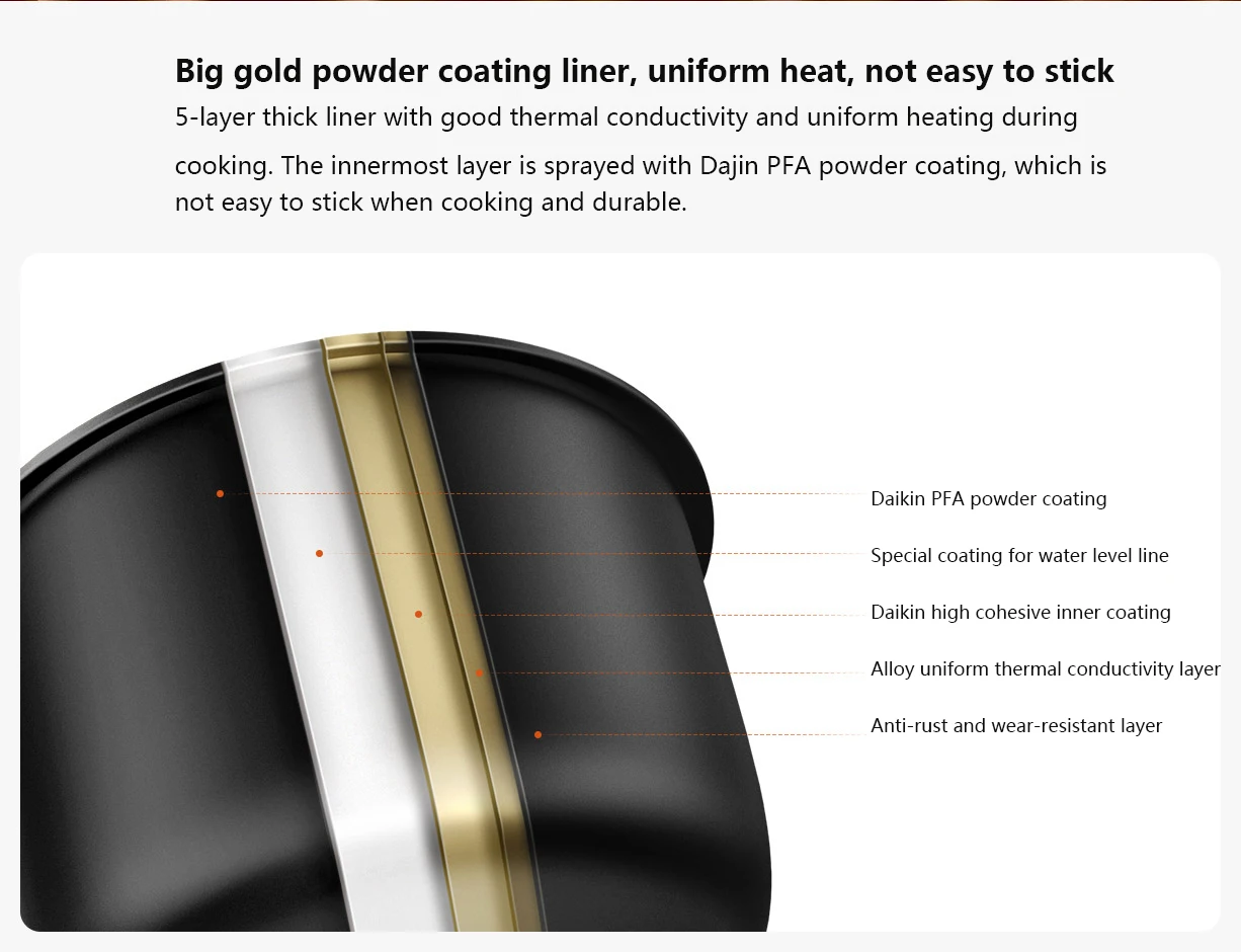 4. Высокая-конец порошок антипригарное покрытие: 5-ти слойной внутренний бак, прочный и не легко наклеивать