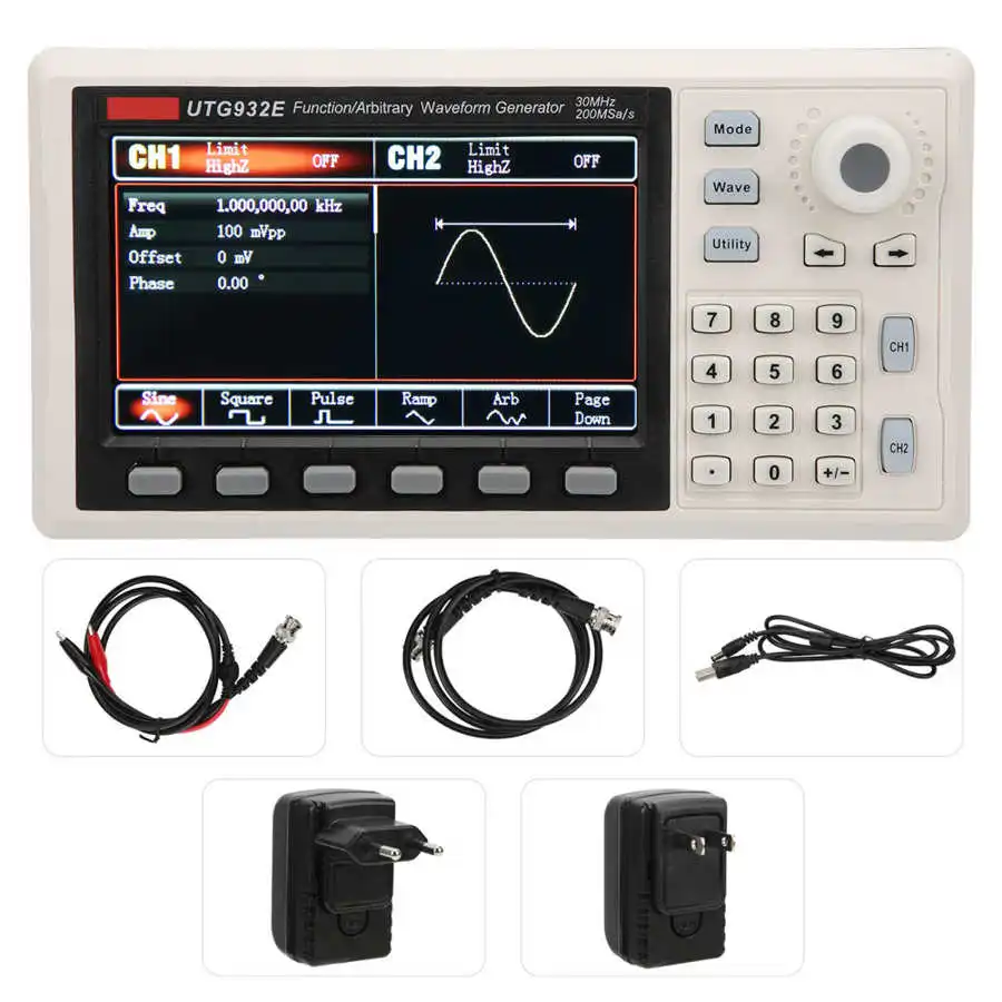 Синусоидальные волны, квадратные волны, пандусы, импульсные волны, шум, постоянный ток, произвольная форма волны
