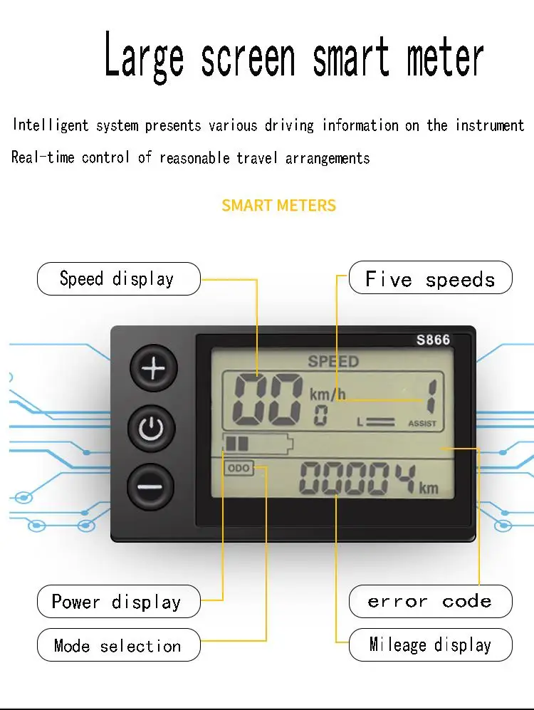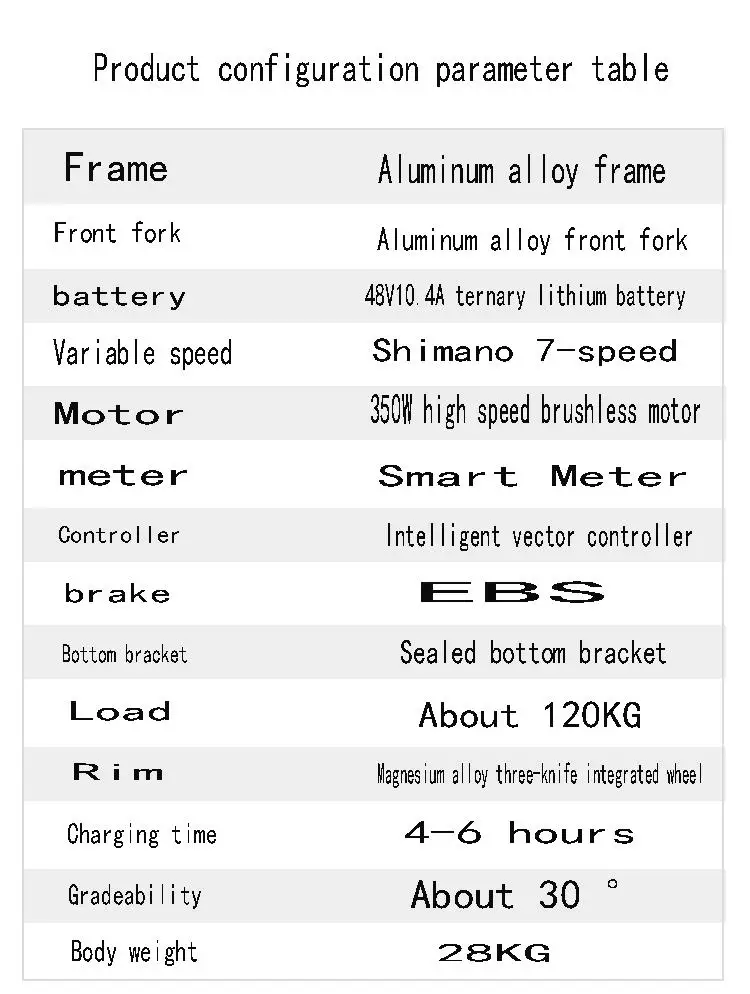 Рамка 20 дюймов алюминиевый сплав рама Передняя вилка Алюминиевые плечевые железные ножки механически блокируют переднюю вилку Нижний Кронштейн Герметичный вал Зубчатая пластина Шестеренная пластина Haomeng 48T Переменная скорость 7SP Педаль Алюминиевая педаль Двигатель 48v250w / 500W / 800W зубчатый бесщеточный мотор Аккумулятор Встроенный Внутренний сердечник 48V 10Ah / lg12.8ah Шина CST20 "* 4,0 Метр S866 жидкокристаллический инструмент Мощность Пятиступенчатая мощность Тормоз Механический дисковый тормоз, тормоз Коробка передач Tx50r палец тянуть, tz500 назад тянуть Прочие Функции Роговой светильник, задний светильник, круиз-контроль, зарядка мобильный телефон кронштейн Вес нетто 28 кг Расстояние выносливости
