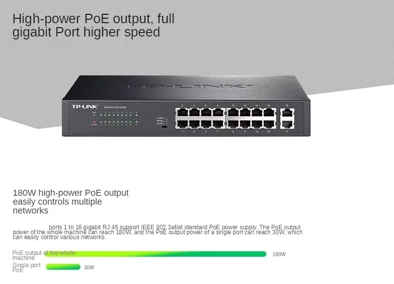 TP-LINK самостоятельно Разработанный полный гигабитный не сетевой коммутатор управления Poe, в котором порты 1-16 поддерживают функцию Poe +, в соответствии с IEEE 802.3af/at стандарт, однопортовая мощность Poe может достигать 30 Вт, а максимальная выходная мощность Poe всей машины составляет 180 Вт. Поддерживает стандартное переключение, мониторинг видео и изоляцию VLAN. В качестве оборудования питания Poe, он может автоматически обнаруживать и идентифицировать оборудование приема питания, которое соответствует стандарту и поставляет питание к нему через сетевой кабель. Plug and play, простой в использовании, подходит для отелей, кампусов, фабричных общежитий и малых и средних предприятий для создания экономически эффективной сети Poe.