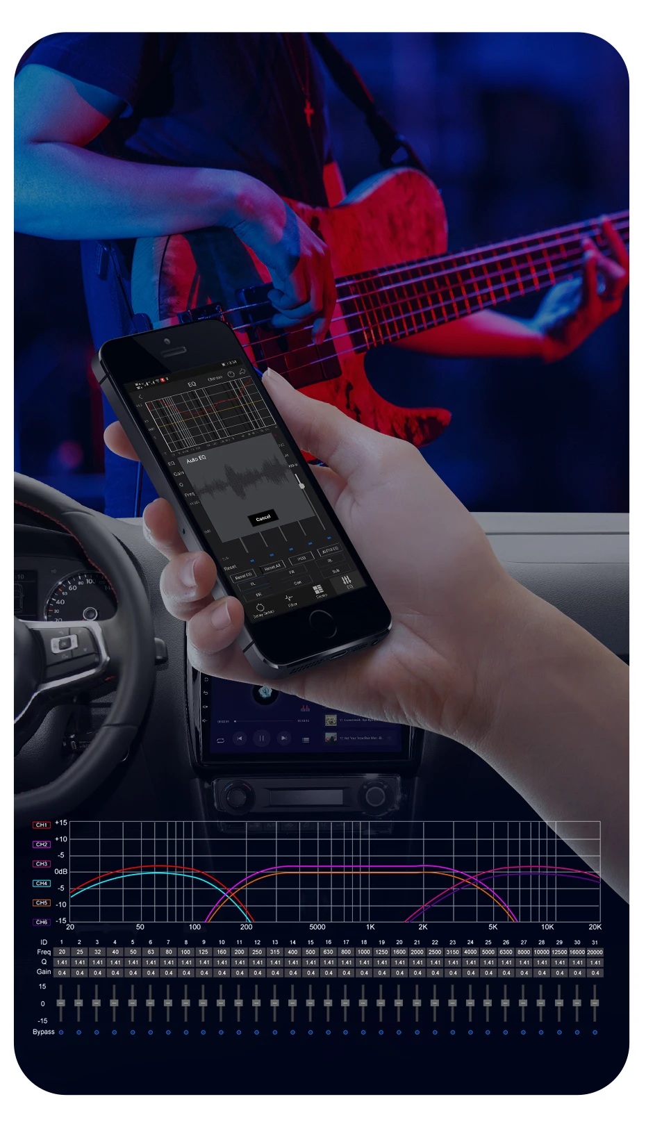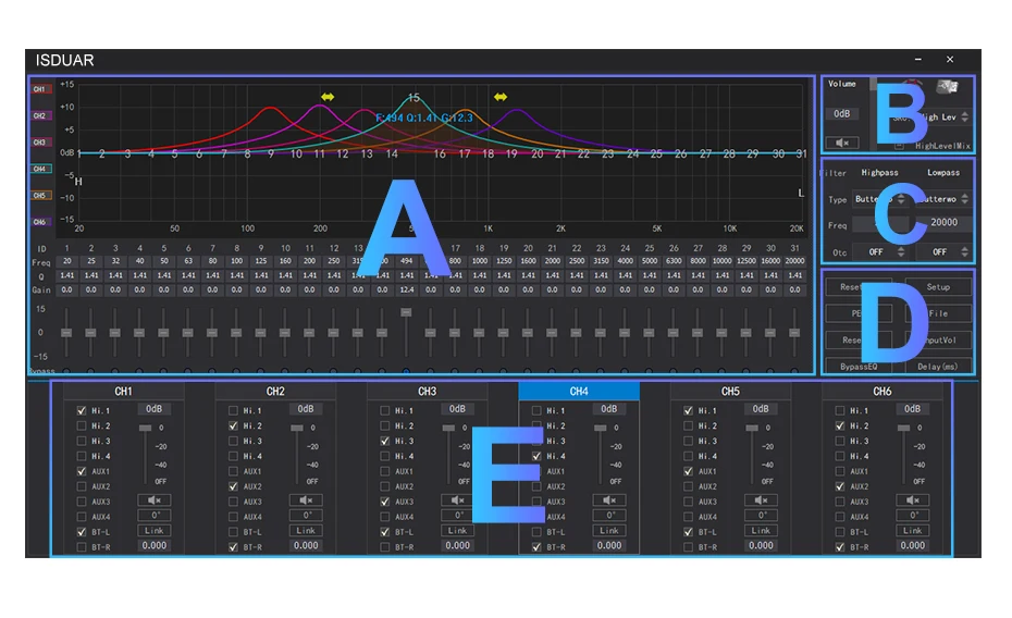 О: 31-полосная Регулировка эквалайзера визуально регулирует частоту, коэффициент усиления и значение Q каждого канала. Вы можете настроить линии канала, как вам нравится.