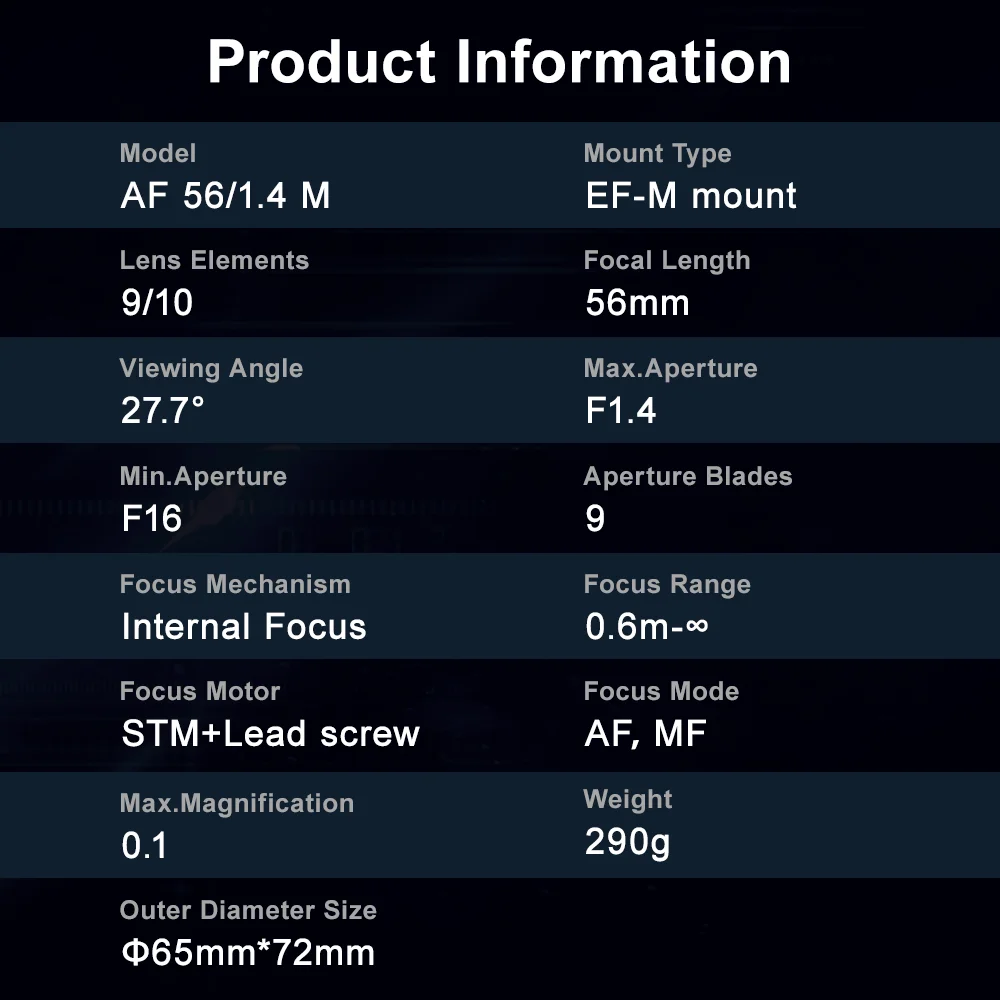Объектив VILTROX AF 56 мм F1.4 M с автофокусом-это объектив с большой диафрагмой, предназначенный для камеры Canon EOS M.