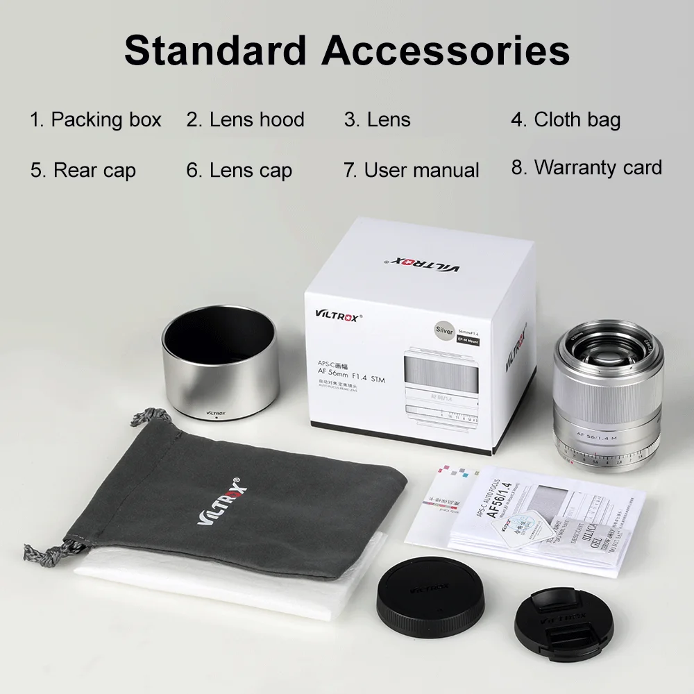1 x VILTROX AF 56/1. Объектив 4 м 1 x бленда для объектива 1 x Передняя Крышка для объектива 1 x задняя крышка для объектива 1 x Руководство пользователя