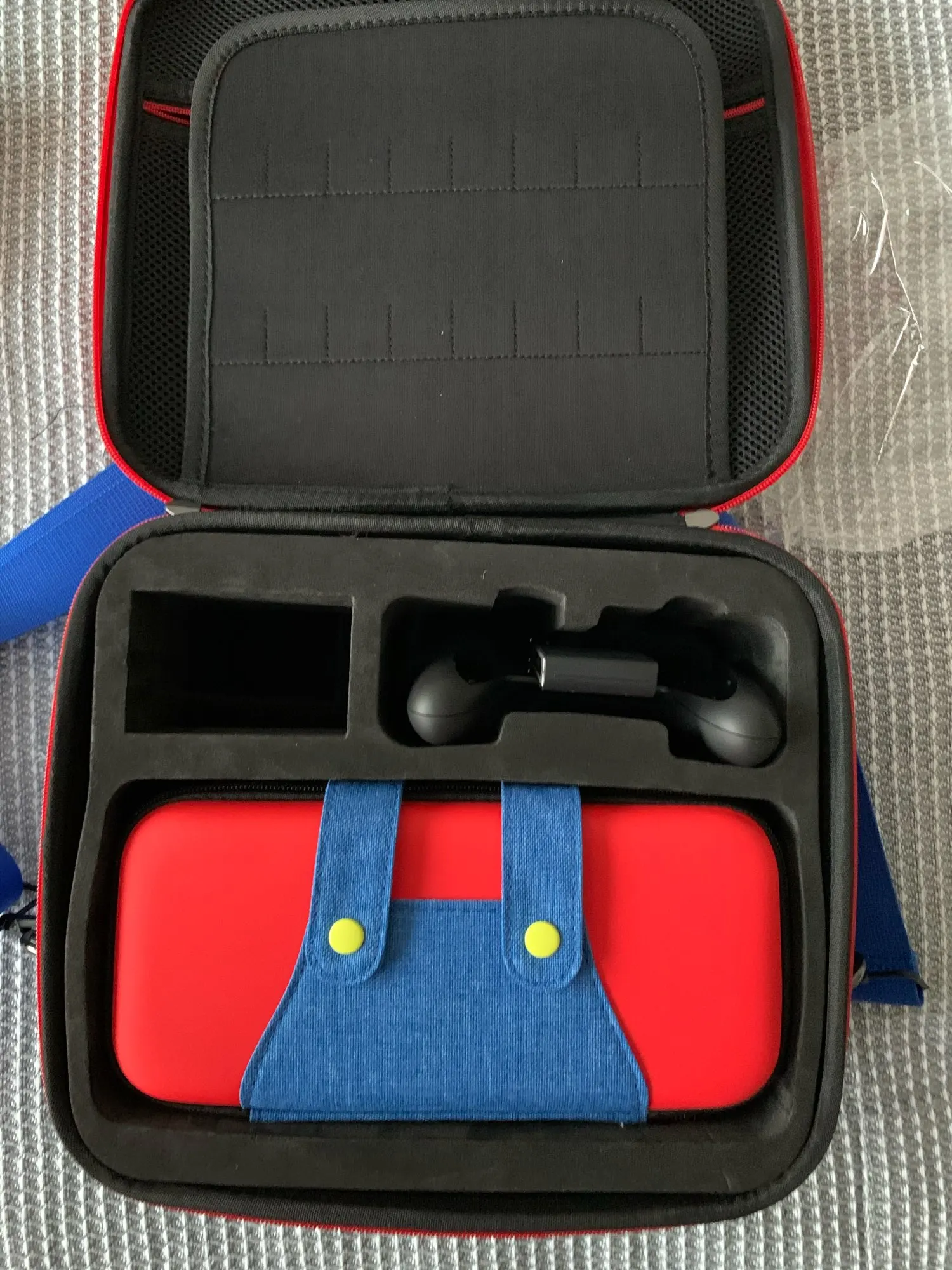 Большое пространство для хранения двух чехлов для хранения 26 игровых карт, консоль Nintendo switch и док-станция, ремешок Joy-Con, ручка Joy-Con, адаптер переменного тока, usb-кабель и кабель HDMI. Внутри есть 2 места для хранения и эластичный сетчатый мешочек с одной стороны, который может хранить различные аксессуары, на Другая сторона-это отдельное пространство, которое отделено для размещения больших аксессуаров. Между двумя помещениями для хранения имеется защитная пластина для предотвращения столкновения аксессуаров с обеих сторон. Защитная пластина имеет отделения для карт