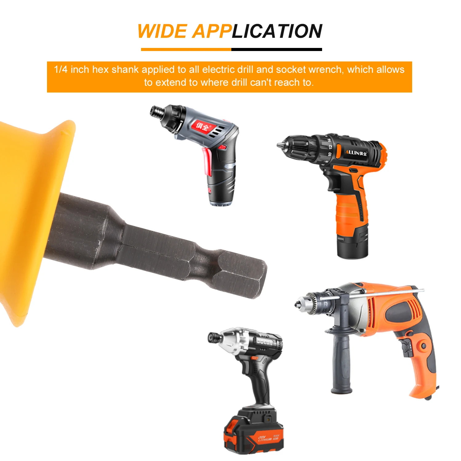 Это расширение угла 90 градусов применяется для всех электрических сверл и торцевых гаечных ключей, что позволяет растягиваться до места, где дрель не может достичь.