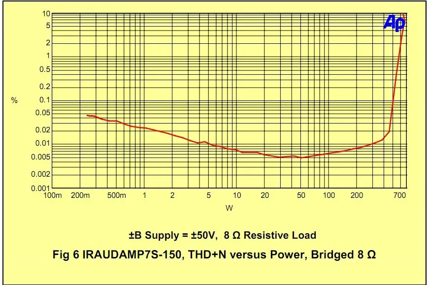 Моно тест (источник питания + -50 в, нагрузка 8R) THD <0.007% мощность 100 Вт THD <0.009% мощность 200 Вт THD <0.02% мощность 500 Вт