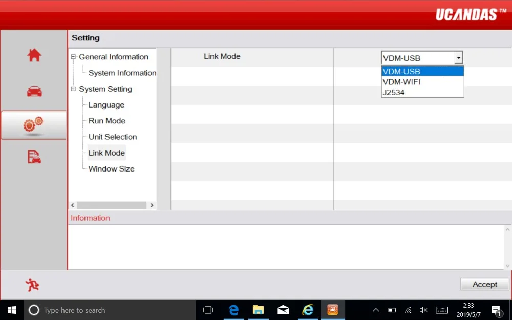 2. Запустите UCANDAS, нажмите «Настройка»-«режим связи»-«VDM-USB»,