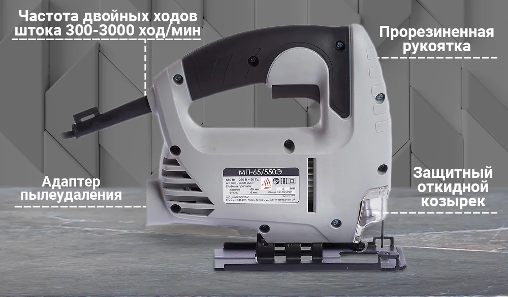 Модель оснащена мощным и надёжным двигателем, имеет обрезиненную рукоятку скобовидного типа, что определяет универсальность применения лобзика. При выполнении длительных работ можно зафиксировать Конопку включения в нажатом состоянии.