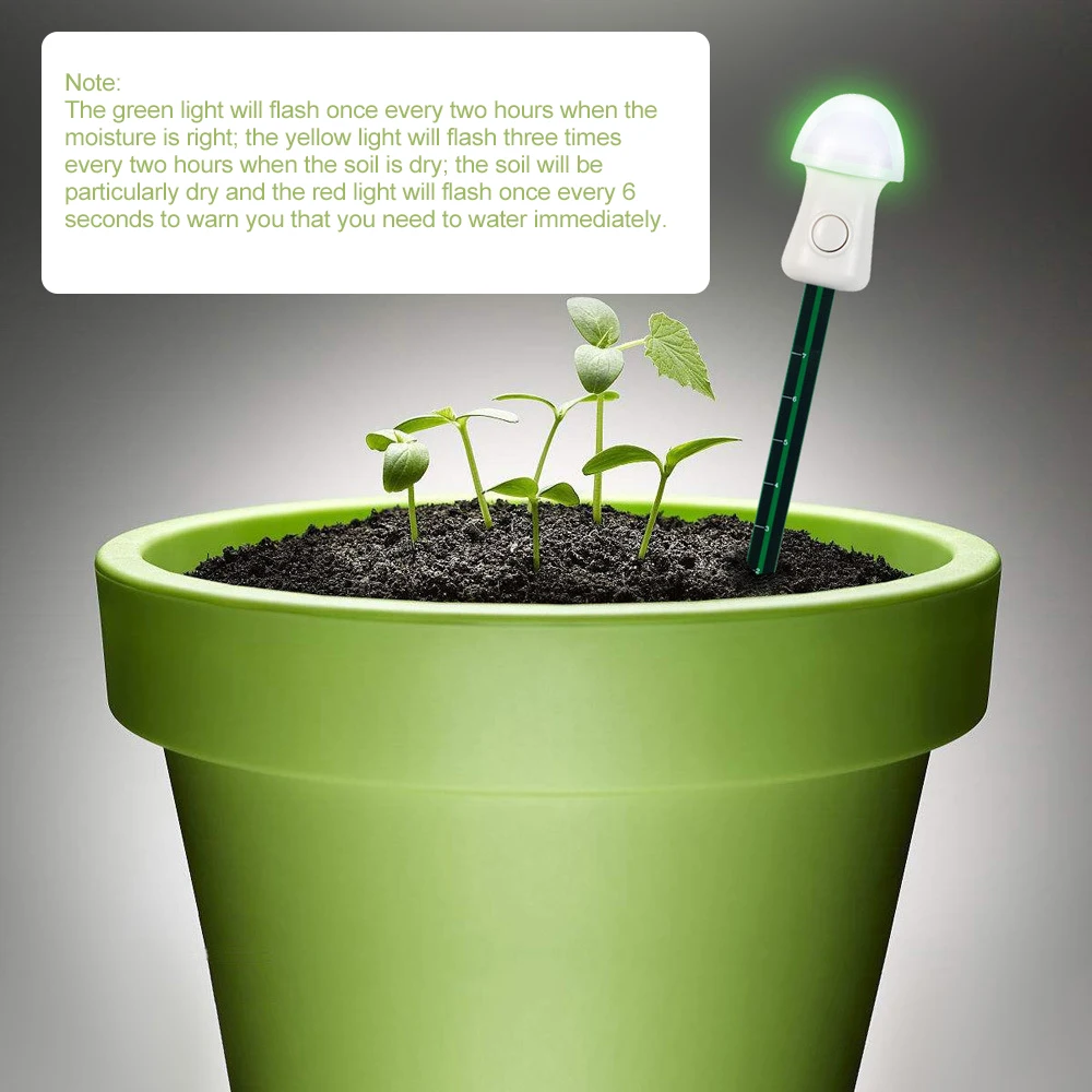 Зеленый светильник будет мигать один раз в два часа, когда влага будет правильной; Желтый светильник будет мигать три раза в два часа, когда почва высохнет; почва будет особенно сухой, и красный светильник будет мигать один раз в 6 секунд, чтобы предупредить вас, что вам нужно немедленно поливать.