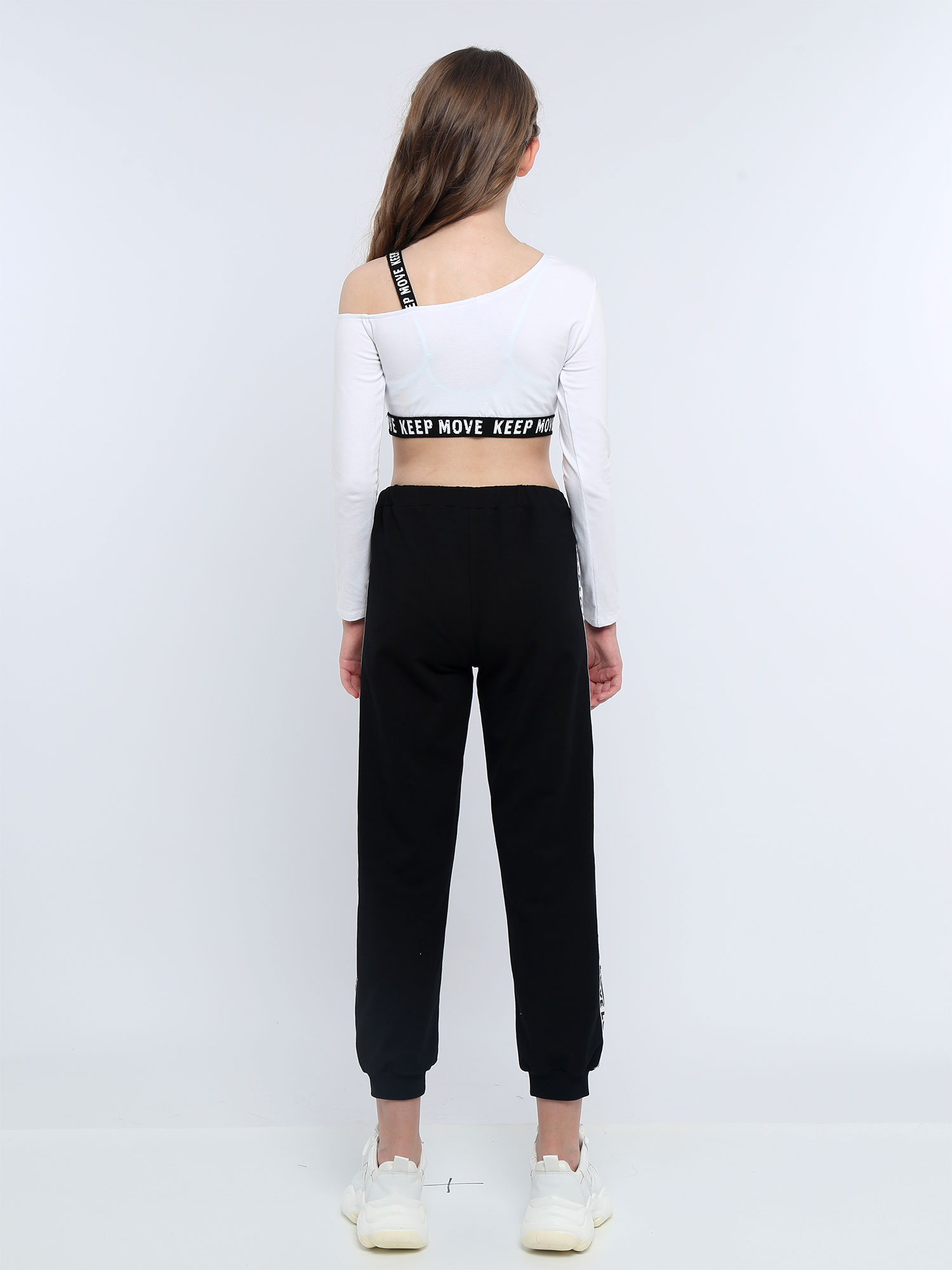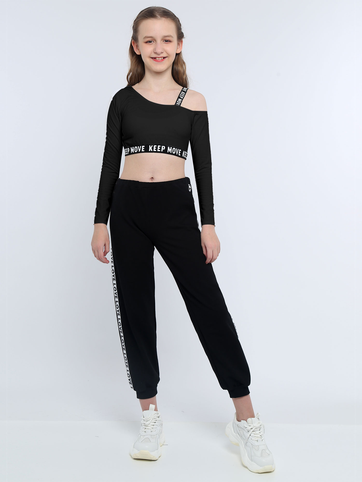 Комплект с асимметричным плечом и длинными рукавами, укороченный топ с буквенным принтом, штаны с эластичной резинкой на талии для девочек.