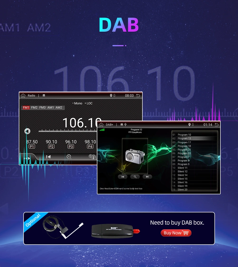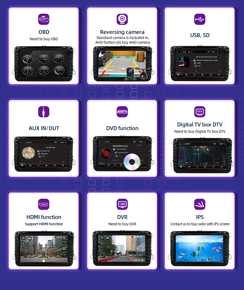 DSP + сенсорный экран + радио + FM/AM + RDS + gps-навигация + карта + Wifi + Bluetooth + управление рулевым колесом + сплит-экран + USB + SD + AUX вход/выход + зеркальная ссылка + камера заднего вида + сабвуфер + Play Sore + EQ + набор обоев + логотип автомобиля + 3G/4G + TPMS + DAB + OBD 2 + DVR + TV