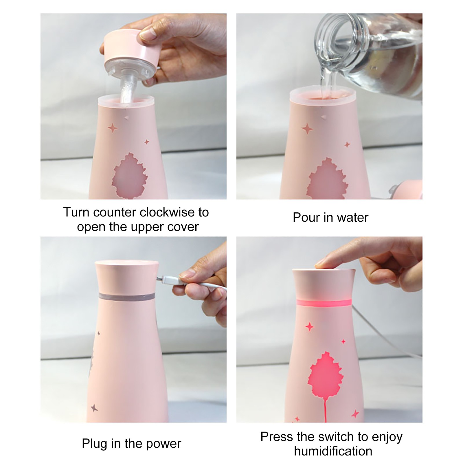 Вставьте usb-кабель в гнездо, нажмите переключатель, и увлажнитель начинает работать.