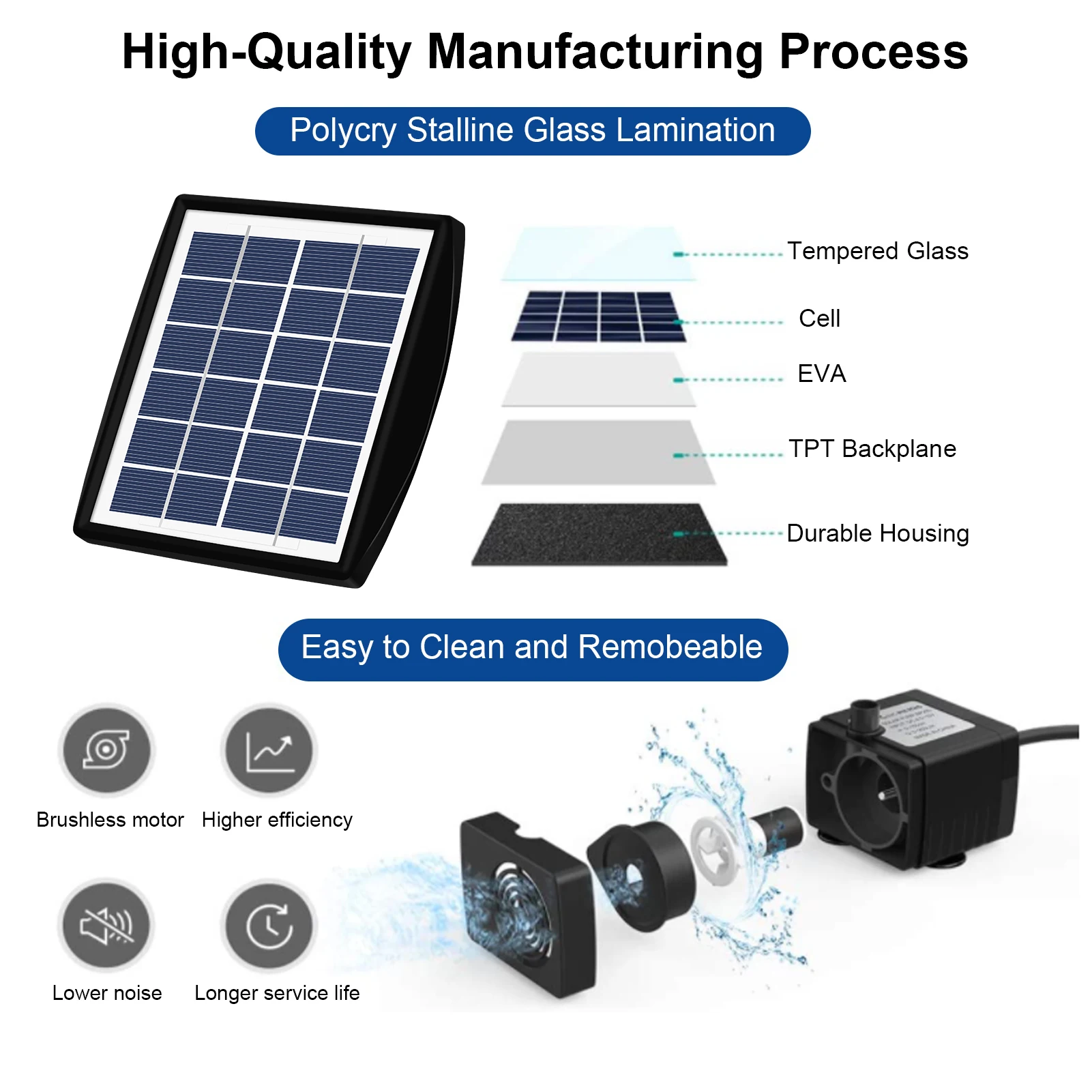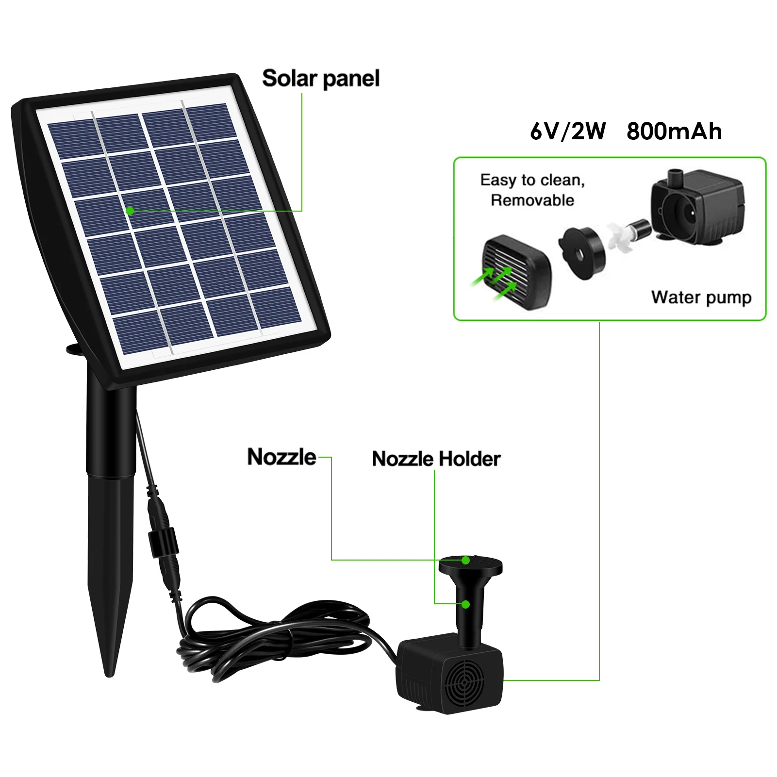 1. Высококачественная солнечная панель s: Эта Солнечная фонтанная панель имеет водонепроницаемую защитную рамку IP65. Технология поликристаллического стекла 6 в 2 Вт. Технология растяжения стекла может расширить и уменьшить уровень дефектов продуктов. Оснащен кабелем длиной 3 метра.