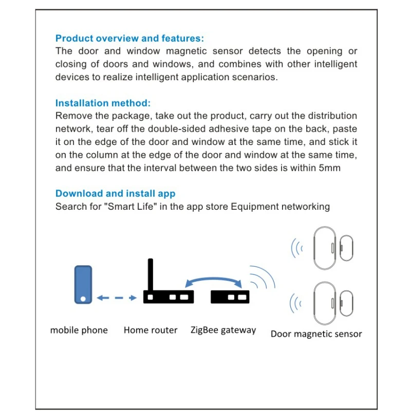 1. Умный датчик двери и окна Tuya ZigBee: беспроводной шлюз Tuya ZigBee должен работать с датчиком двери и окна, а также с различными интеллектуальными продуктами ZigBee, Который оказался центром управления мостами для умных домов и играет незаменимую роль для всех продуктов ZigBee и реализует всю интеллектуальную связь вашего дома. Просто добавьте датчик в концентратор ZigBee после добавления концентратора в приложение Smart Life/Tuya.