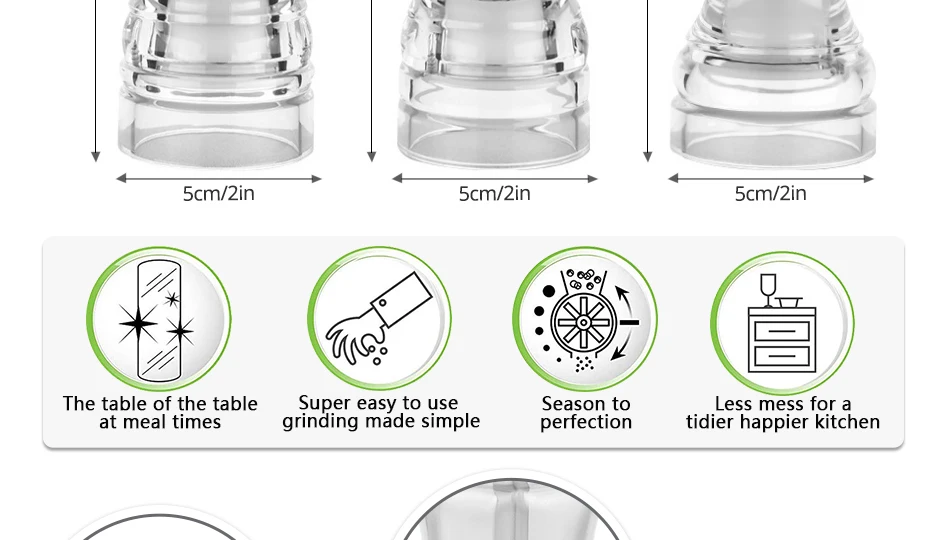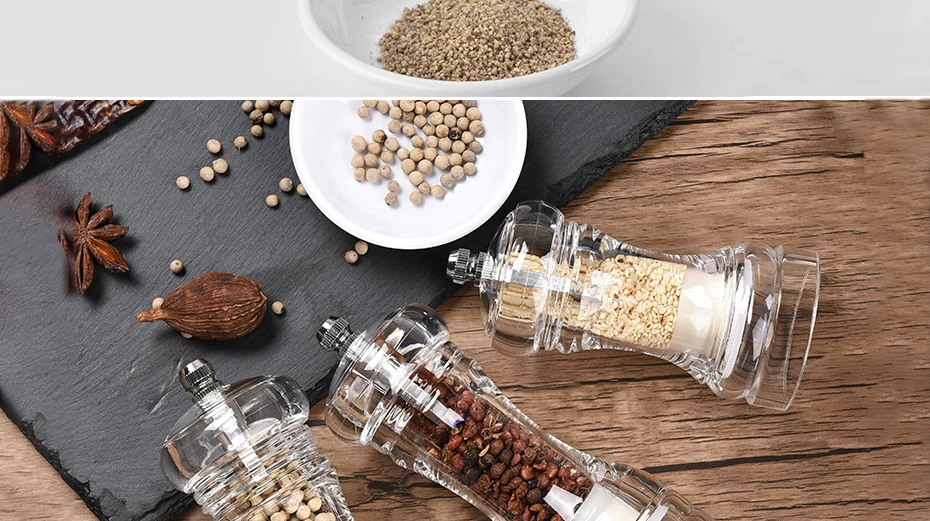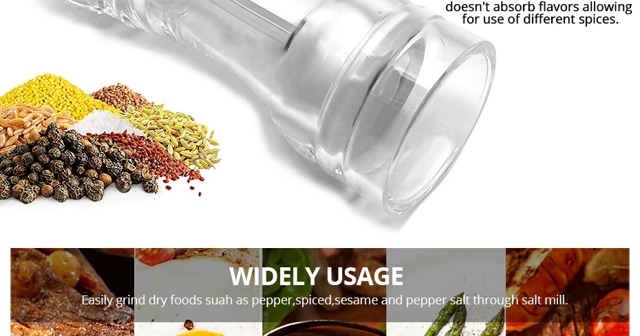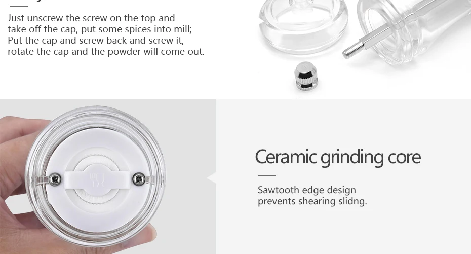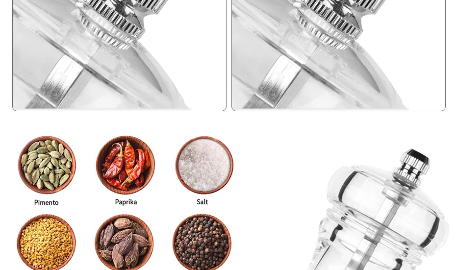 Быстрое шлифование в одну секунду, без потери восхитительности, прозрачный и толстый, двойное касание, простота в эксплуатации Керамический шлифовальный сердечник: без гальваники, без ржавчины, безопаснее нержавеющей стали, более сильная коррозионная стойкость Выбранный материал: Выбранный акриловый материал, без краски или клея, чтобы обеспечить здоровый и оригинальный вкус пищи Регулируемая толщина: крышка винта из нержавеющей стали регулирует толщину перца.