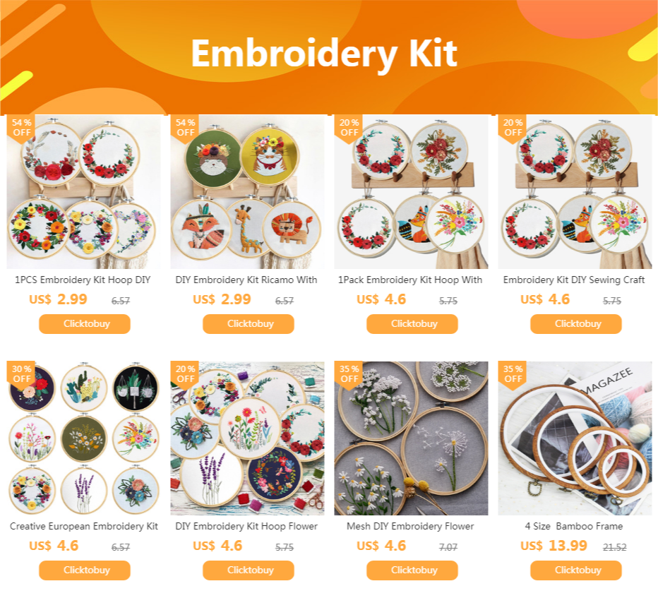 Продукция включает: пластиковые пяльцы для вышивания, ткань с узором, нитки, иглы