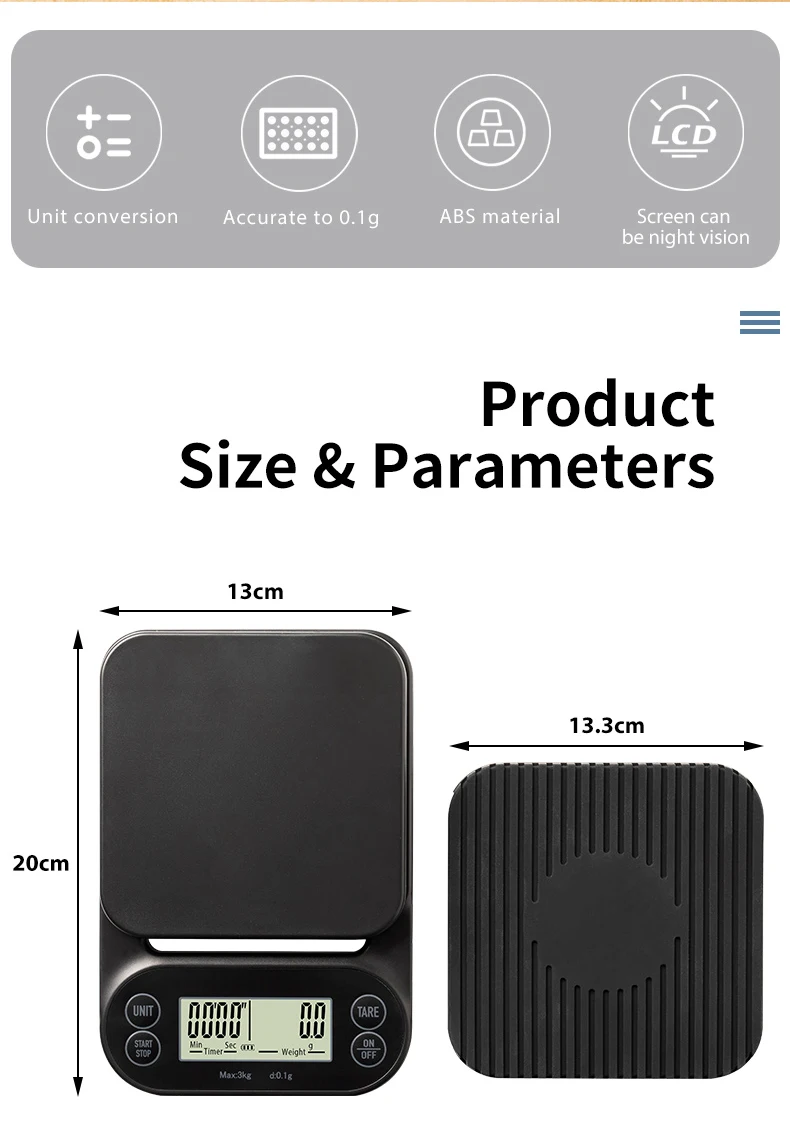 Кофейные Весы-это шкала, которая измеряет количество горячей воды и время извлечения кофейных зерен одновременно. Это основной ингредиент для приготовления вкусного кофе, приготовленного вручную. Также подходит для производства кухонной еды
