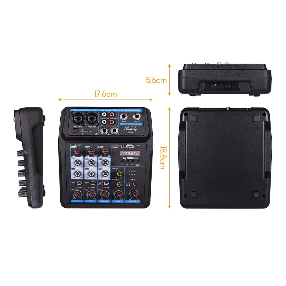Это многофункциональный 4-канальный микшерный пульт с звуковая карта. Он может удовлетворить многие требования пользователей, такие как домашняя музыкальная продукция, прямая трансляция, караоке и т. д.