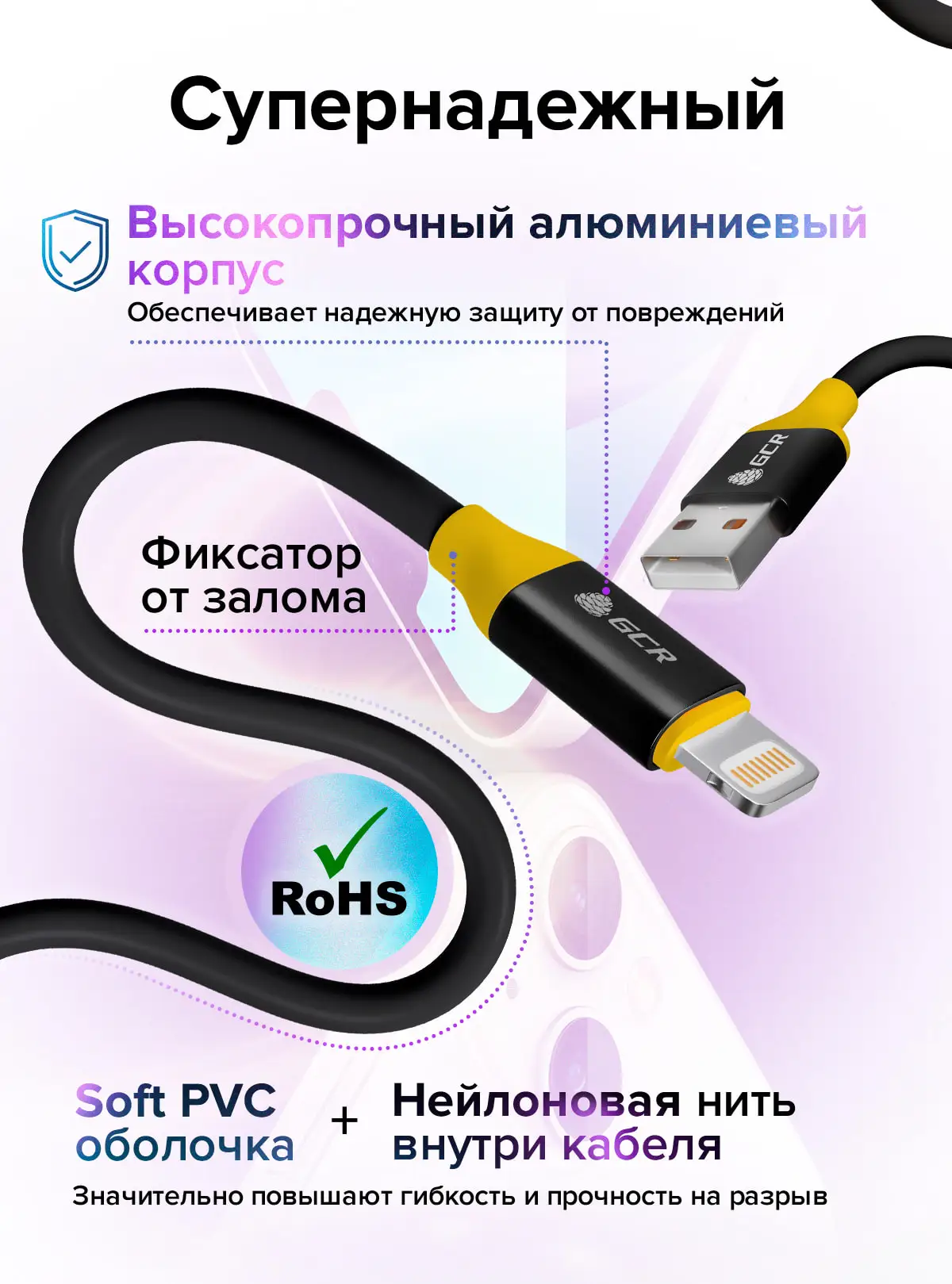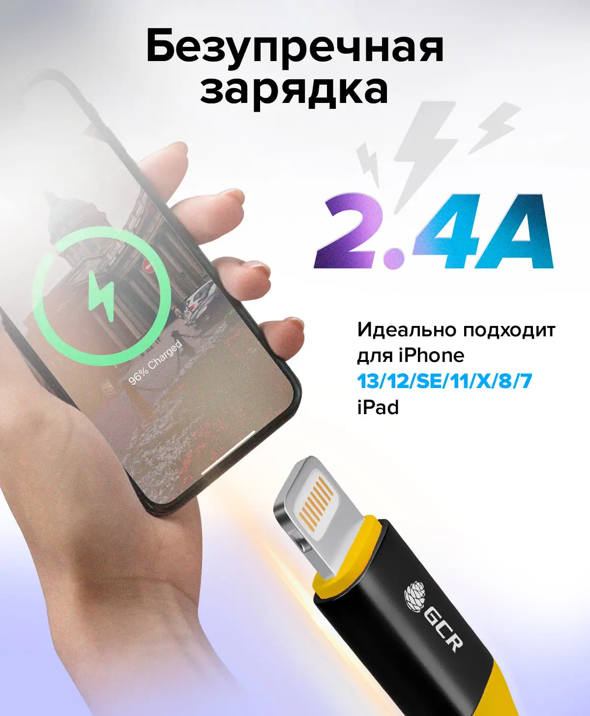 Элегантный и практичный кабель GCR Lightning предназначен для зарядки iPhone 12/11/Х/8/7/6/5, iPad и скоростной передачи данных по стандарту USB. Кабель обладает встроенным 75 MFI, поддерживает последние версии iOS, и потому универсален для мобильных устройств Apple.
