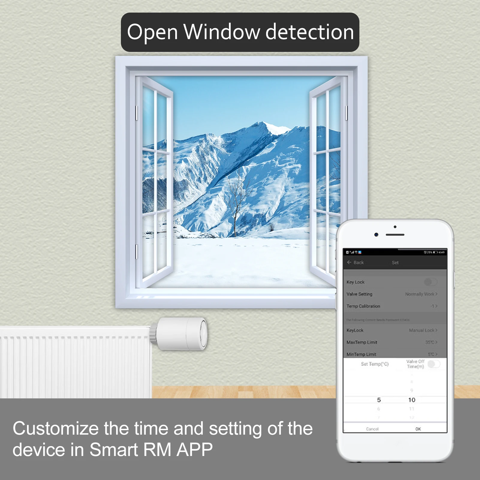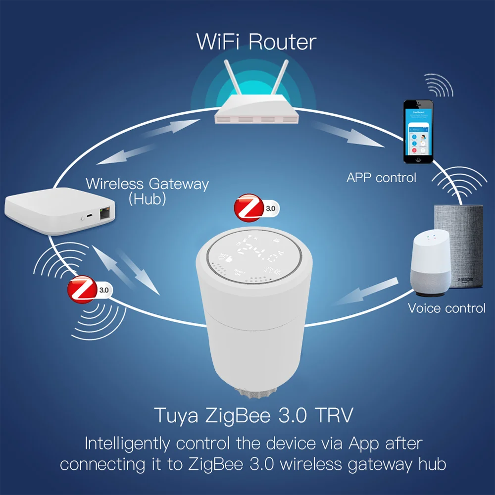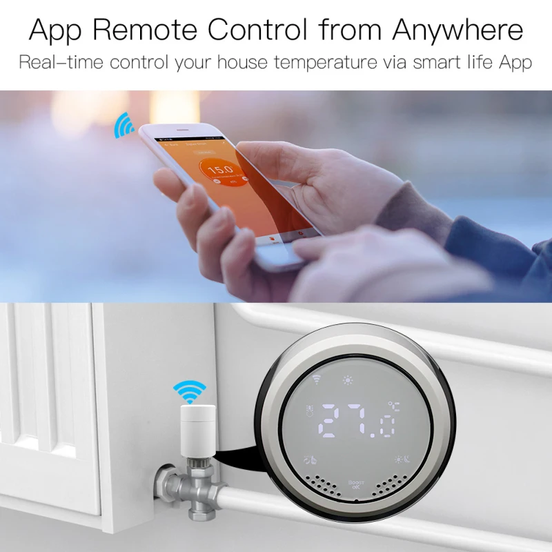 Легко установить его: Открутите адаптер и вставьте его в клапан, затем затяните адаптер и поверните корпус контроля температуры на адаптер. Доступны несколько режимов: режим boost, комфортный режим, режим отпусков, автоматический режим, ручной режим, энергосберегающий режим на выбор. С функцией будильника с низким энергопотреблением, когда электричество заканчивается, это напомнит вам, поэтому вам не нужно беспокоиться о внезапном истощении электричества, мешает использованию. Автоматический режим: вы можете выбрать метод работы от 5 + 2, 6 + 1, 7 дней и 6 периодов. После выбора нажмите кнопку, чтобы ввести настройки времени первого периода рабочего дня, а затем еще раз нажмите кнопку, чтобы установить температуру для остального и завершить настройки. После подключения с помощью приложения ZigBee g-ateway вы можете регулировать температуру через свой телефон, что является умным и удобным.