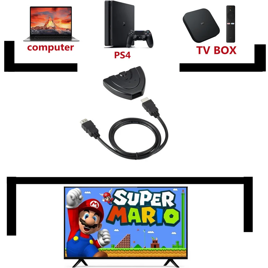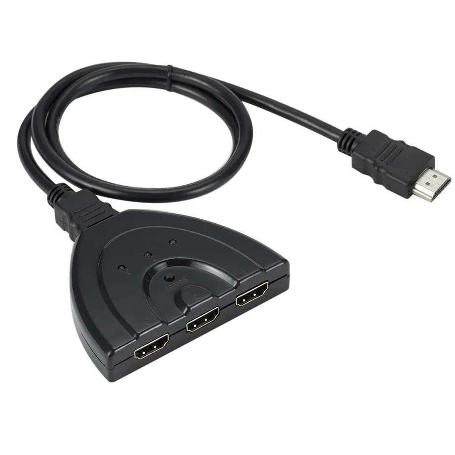 Посылка включает в себя: 1 х HDMI переключатель Особенности: Умный ручной переключатель управления, имеет функцию переключения клавиш. 3 порта HDMI in и 1 выход HDMI для различных устройств HDMI. Разрешение HDTV 1080P Один фиксированный 1.8FT HDMI кабель (pigtail), подключи и работай. HD аудио и HDCP совместимый. Описание: Аудио форматы: LPCM, DOLBY AC3,DTS7.1. Прямой поток цифровой. Нет искажений аудио или видео, нет задержки передачи сигнала. Для работы этого переключателя Нет необходимости в адаптере питания. Кабели HDMI имеют возможность обеспечивать питание от подключенных устройств. Характеристики: Материал: пластик, металл Цвет: черный Ширина: 80 мм Длина кабеля: 500 мм