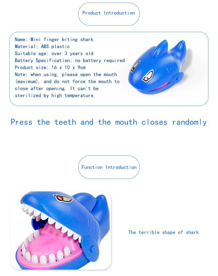 Название: пальчиковая игрушка для кусания Материал: пластик Подходящий возраст: старше 3 лет Спецификация батареи: батарея не требуется Метод упаковки: OPP мешок Функция: после нажатия на зубы рот будет закрыт случайным образом, чтобы увидеть, кто будет Укушено. Тренируйте реакцию ребенка, скорость рук и мужество (верхние зубы мягкие Клей, не повредит руку). Веселее играть с большим количеством людей. Примечание: При использовании, пожалуйста, откройте рот (максимум) и не заставляйте рот закрываться после Открытие. Его нельзя стерилизовать при высокой температуре.