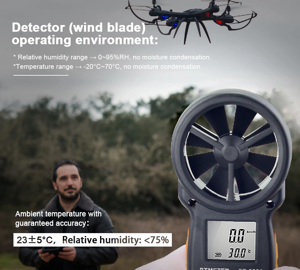 【Высокоточный Диапазон скорости ветра 0,3 ~ 40 м/с, +/- 2.0% считывания + 50, дисплей в 5 единицах: m/s, km/h, ft/min, узлы, миль/ч; диапазон температур ветра 14 °F ~ 140 °F, +/-2,7 °F дисплей в 2 единицах ℃℉цельсия, по Фаренгейту; Диапазон потока ветра 0 ~ 9999 ft3/мин