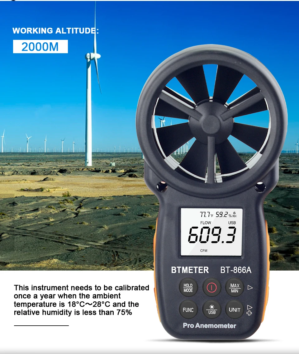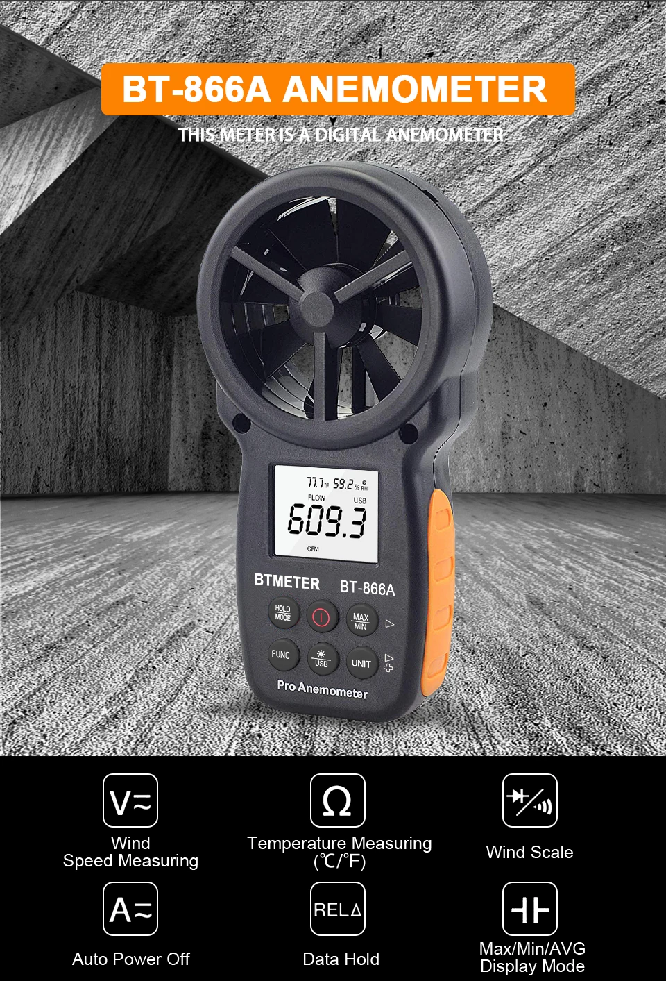 BTMETER HVAC Анемометр CFM Meter BT-866A Ручной цифровой измеритель скорости ветра для 0,3 ~ 40 м/с скоростью ветра, температурой, воздушным потоком, влажностью, точкой росы с подсветкой USB регистрация данных
